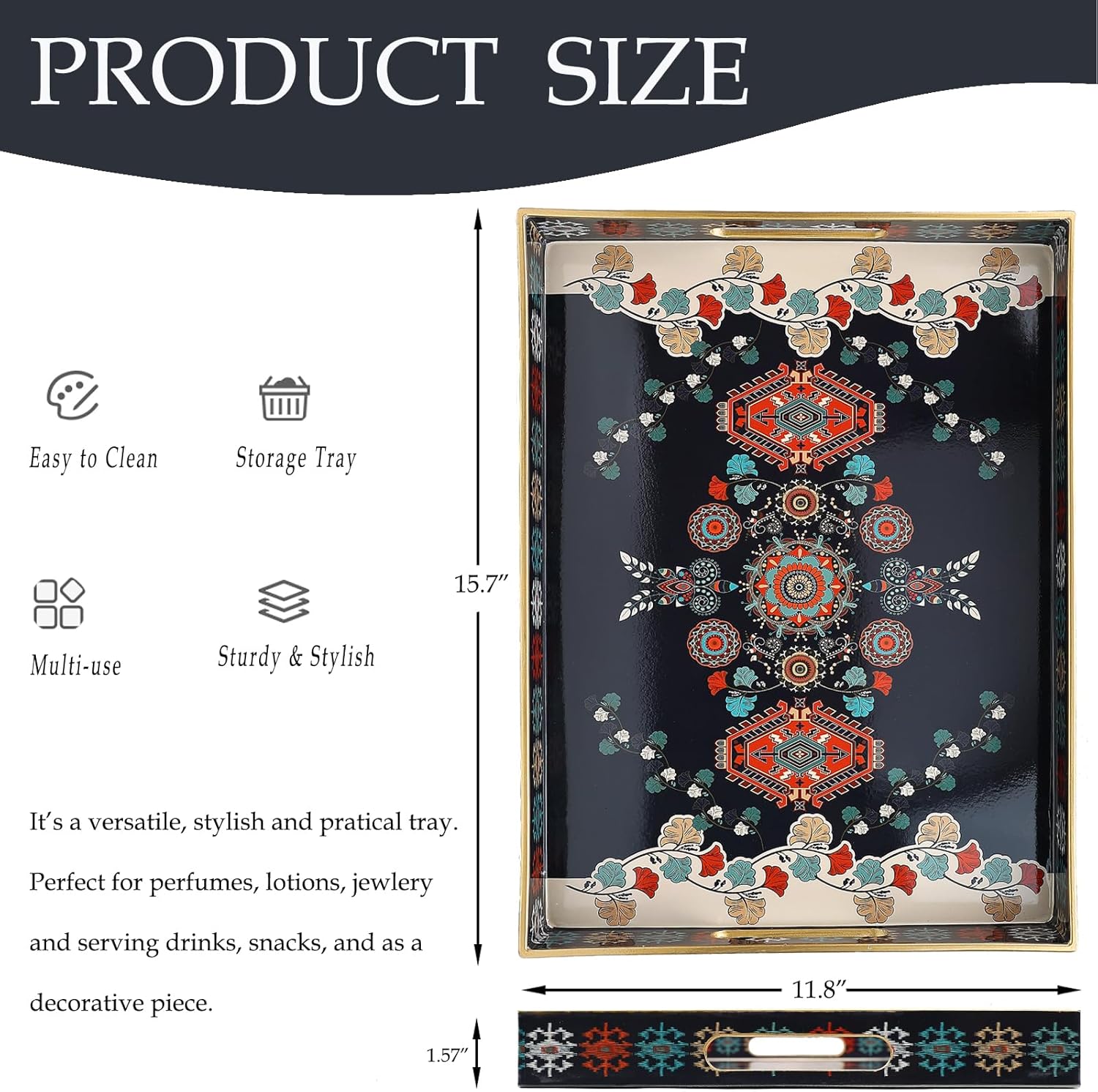 - Versatile design: Whether you're hosting a dinner party, serving snacks, or organizing your workspace, this tray is up to the task. Its classic rectangle shape and ample size (15.7 INCH*11.8 INCH*1.57 INCH) provide plenty of space for all your needs.