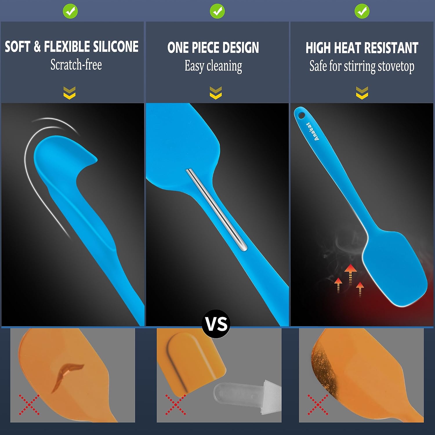 - NO MELTING ISSUES - Anaeat High heat resistant spatulas are made with food grade, BPA Free Silicone, which is safety-tested, heat resistant up to 460°F. Anaeat premium solid silicone design won't let you down by melting or warping.