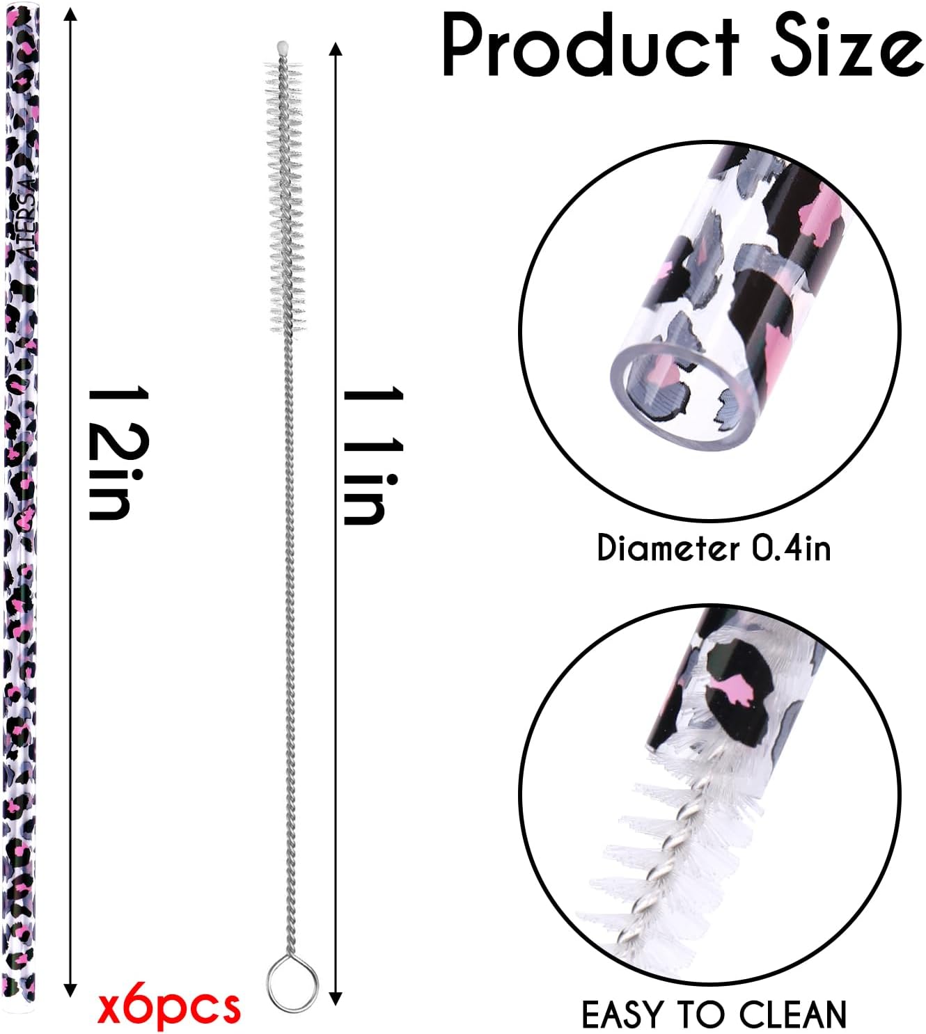 AIERSA 6 Pack Leopard Straw Replacement 40oz for Stanley,Plastic Reusable Straw for Stanley Adventure Quencher Travel Tumbler,Long Straws with Cleaning Brush for Stanley Cup Accessories