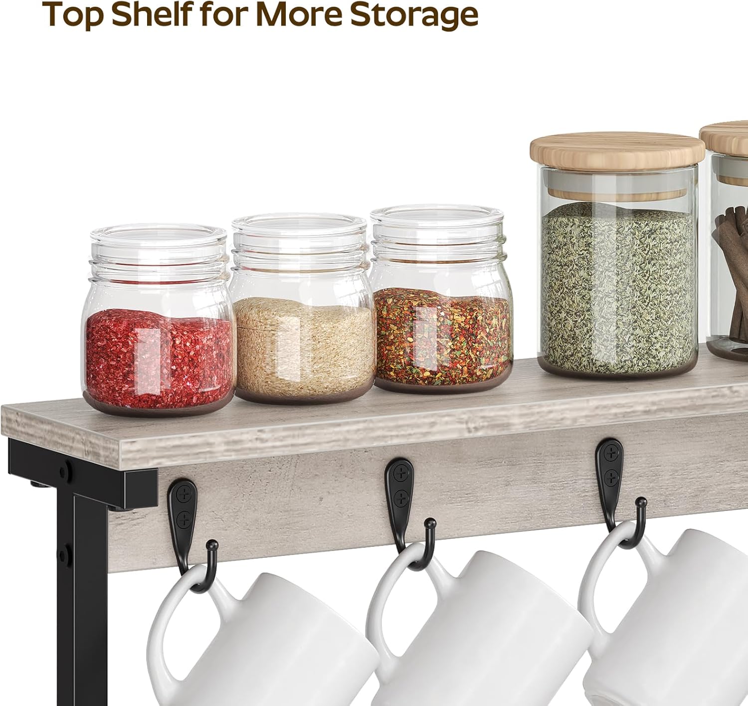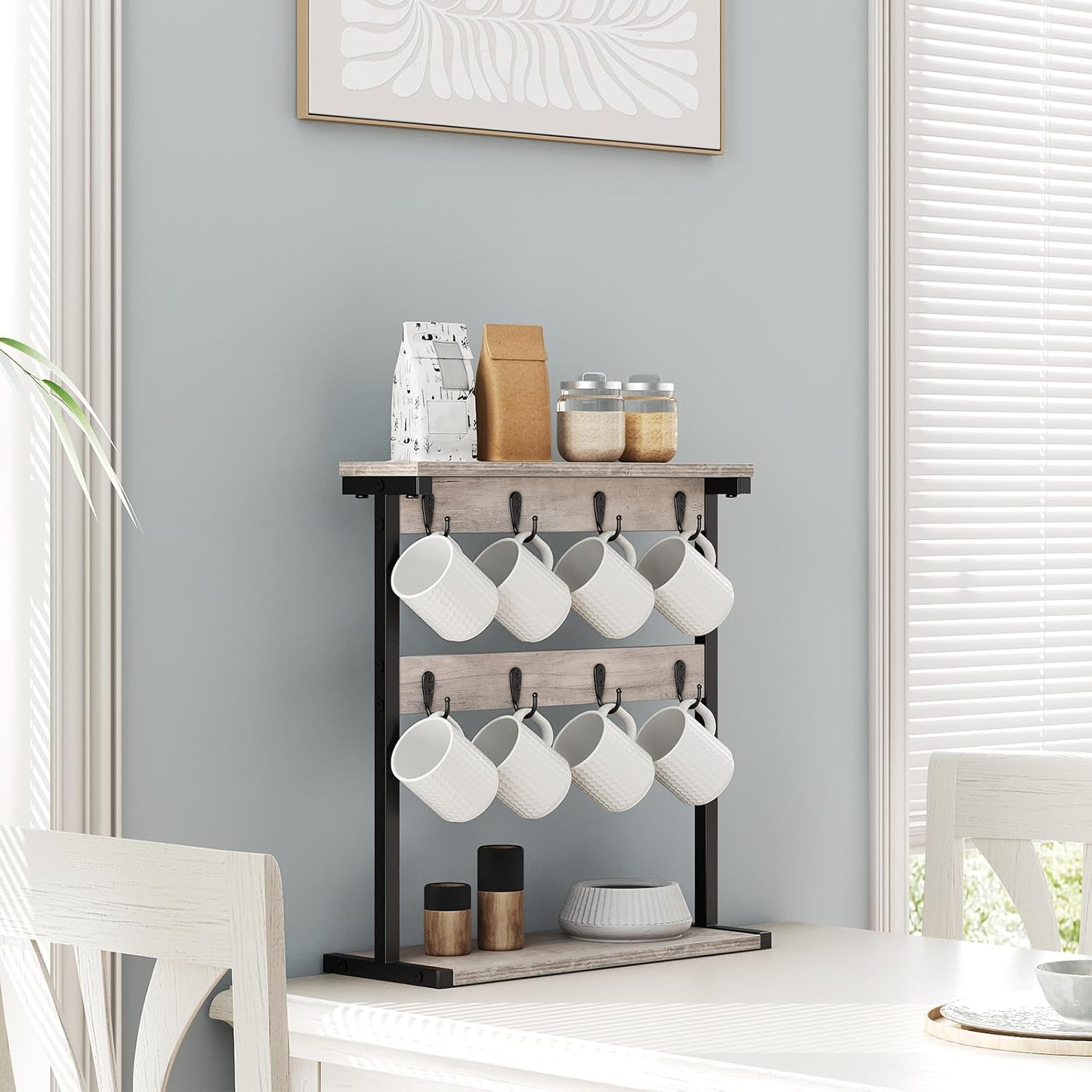 - Two Storage Options: This mug holder stand has 8 hooks that can hang mugs, coffee cups or tea cups etc. and 2 open shelves as the reasonable place for goblets or wine cups, so that you can prepare your favorite drink at any time