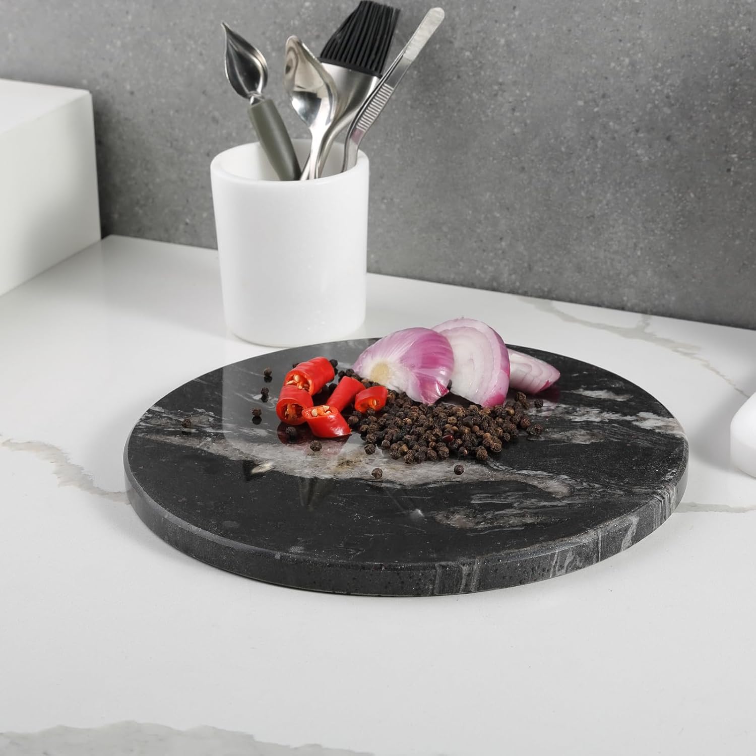 - KITCHEN ESSENTIAL: The unique marble cutting board serves as a highlight in your kitchen. Exquisite marble patterns and natural material elevate your kitchen into a stylish culinary space. While its non-slip feet securely hold the board in place during prep, helping to guard against injury, its convenient non-stick surface allows for the easy rolling of dough, pastries, and fondant with a minimal amount of flour. It's even great for chocolate tempering and serving cheese!