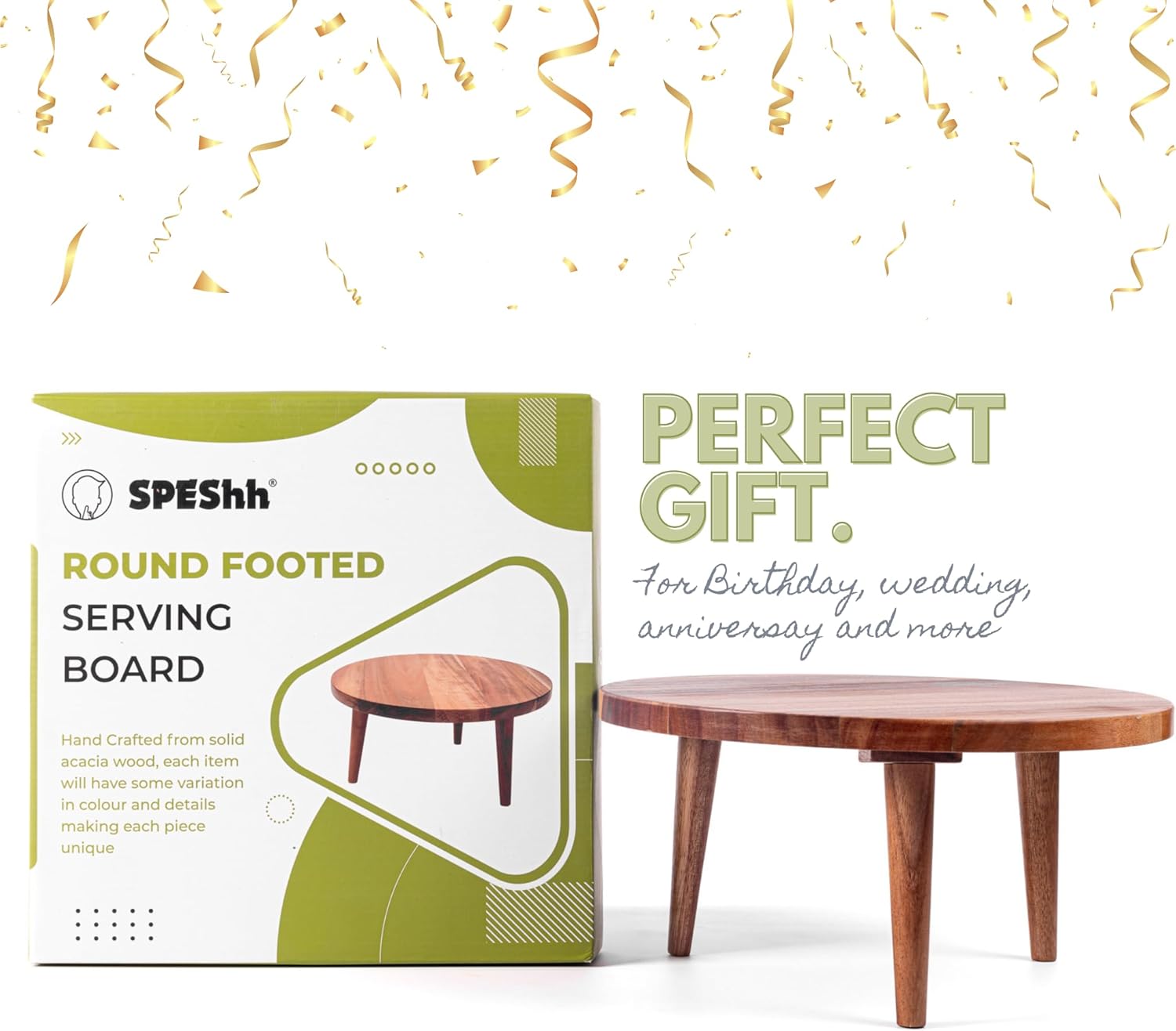 - Thoughtful Gift - The SPEShh Acacia Wooden Round Footed Serving Board makes a perfect gift for food enthusiasts, host/hostess, or anyone who appreciates stylish and functional kitchen accessories. Its versatile design and stunning aesthetics make it an ideal choice for housewarmings, weddings, birthdays, or any special occasion.