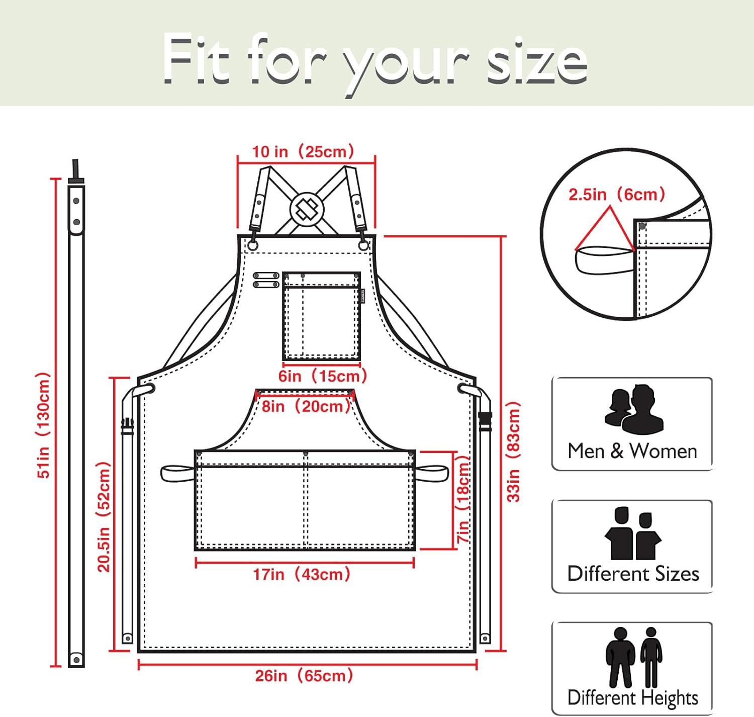 - Universal Size: The apron size is 25.5 inches x 32.5 inches, suitable for full coverage size. The ultra-long, quick-release strap can accommodate multiple sizes, up to men's XXL size (51 inches waist circumference)
