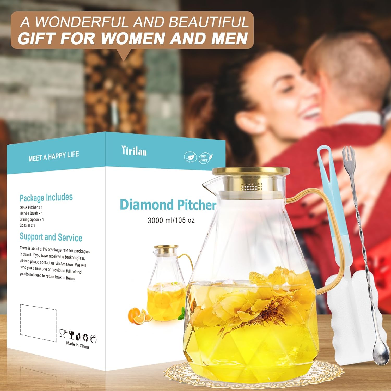 Yirilan Glass Pitcher, 3 Liter Water Carafe With Lid, Iced Tea Pitcher for Fridge