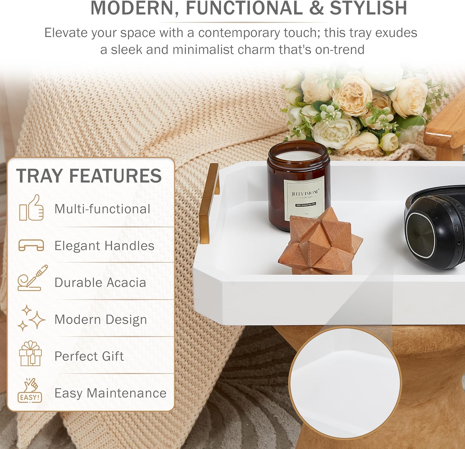 Decorative Acacia Wood Ottoman Tray - Coffee Table Tray - Breakfast, Party, Drinks, Snack, Liquor Serving Platter - Farmhouse to Modern - Brass Handles (Moonlight White)