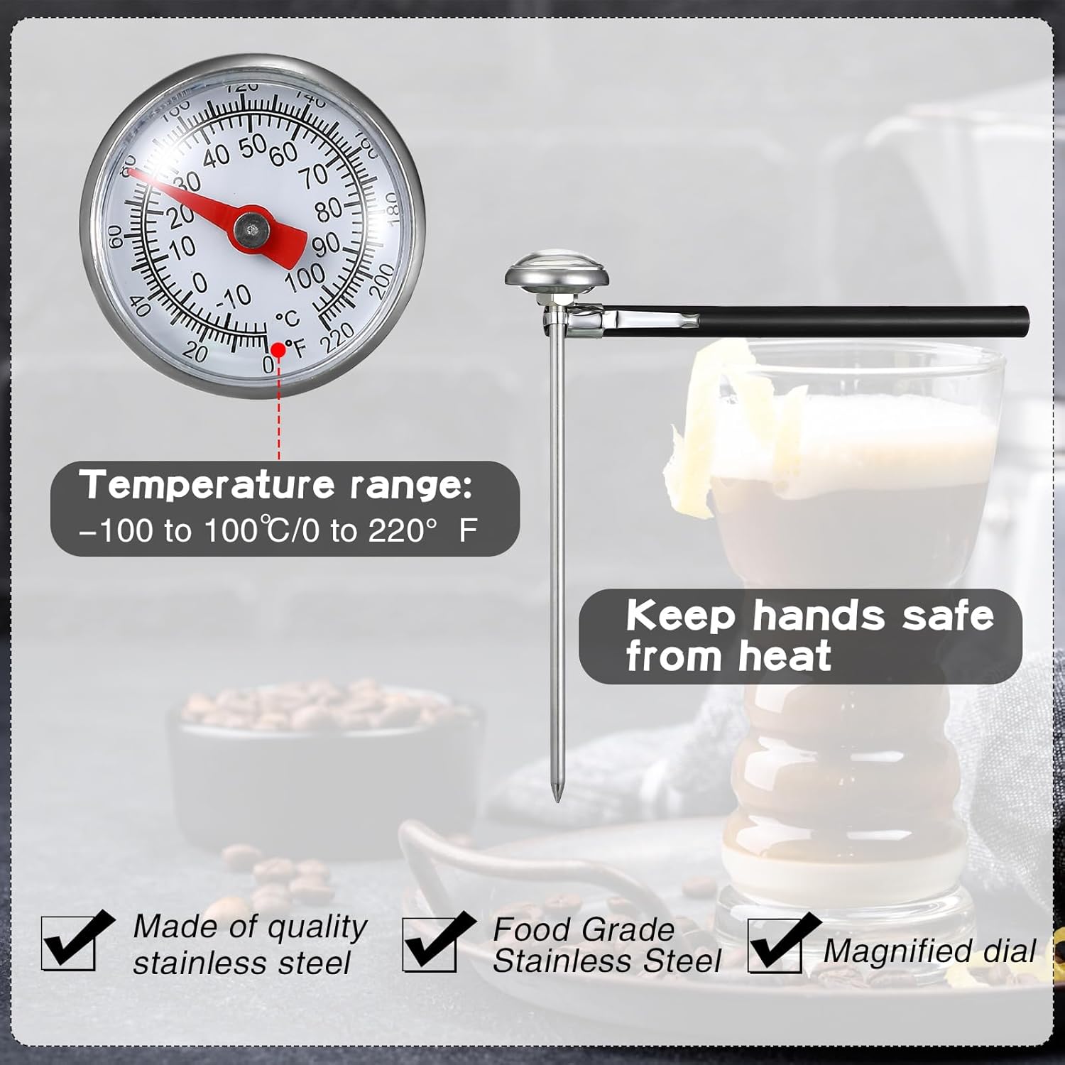 - Easy and Practical: with a fine material and a simple appearance, you can use our thermometer for cooking to measure the temperature of milk, coffee, drinks, red wine, tea, water and so on, easy and practical, a good helper in your kitchen