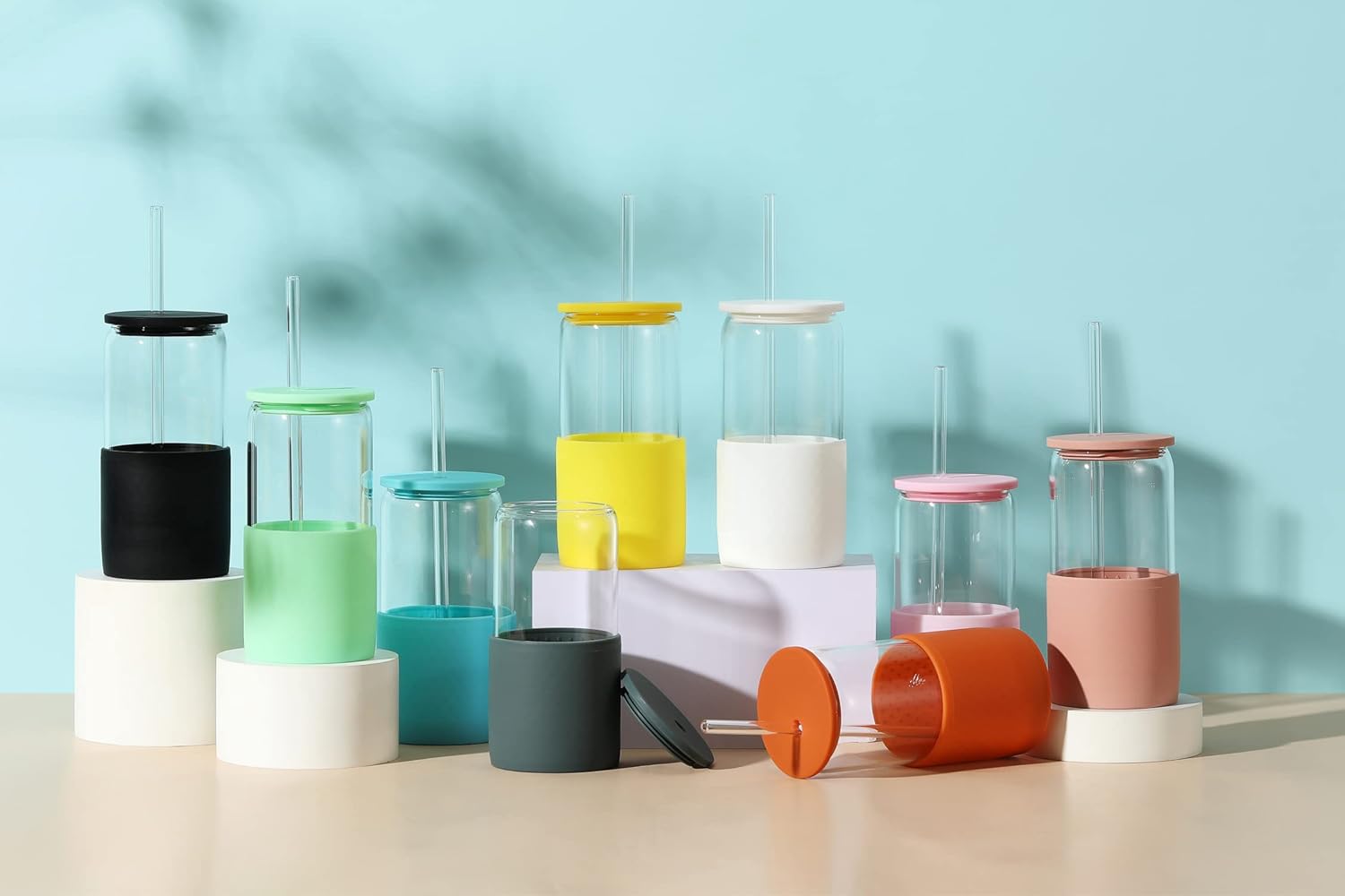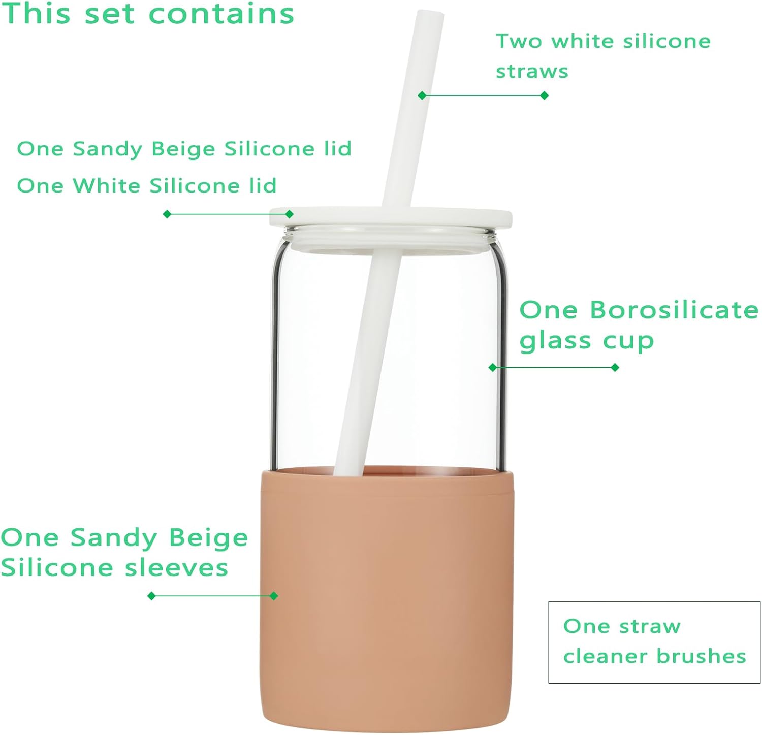 - The two colored silicone lids are interchangeable. This set contains one borosilicate glass cup, one sandy beige silicone sleeve, one white silicone lid, one sandy beige lid, two white silicone straws, one straw cleaner brush.