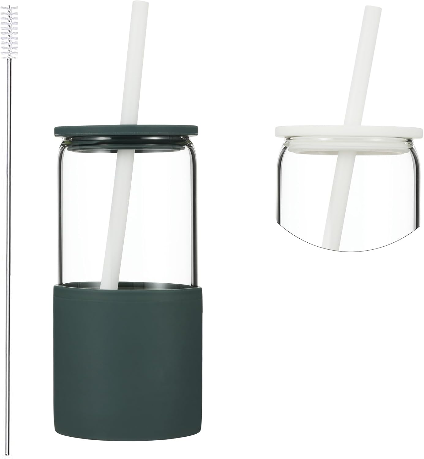 Sunseeke Glass Tumbler with Straw and Lid, 16oz Ice Coffee Cup, Silicone Sleeve Cleaning Brushes, Drinking Glasses for Water, Iced Coffee, Smoothie - BPA Free (Slate blue-gray)