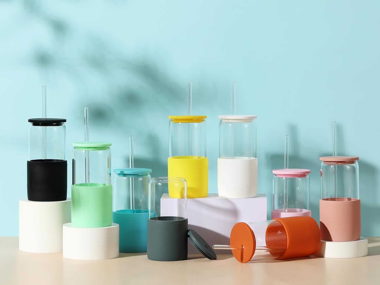 - Match the sleeve and lid colors for a customized look. This reusable, jar-shaped glass is perfect for coffee, tea, juice, soda, shakes, cocktails and more.