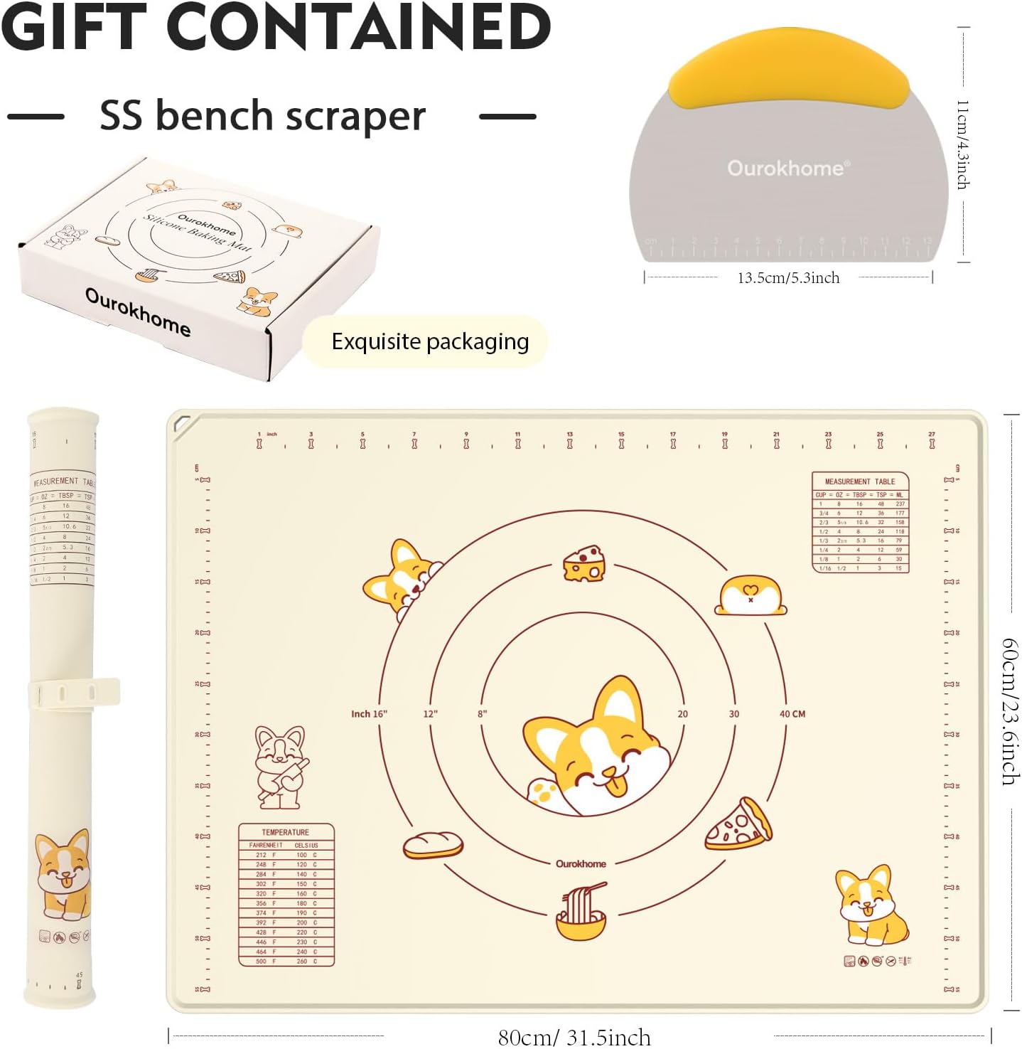 - Your go-to solution for hassle-free baking: Made from high-quality food-grade soft platinum silicone. Save your countertop from getting messy. Say goodbye to floor all over the flour. Included a bench scraper with scale and conversion table