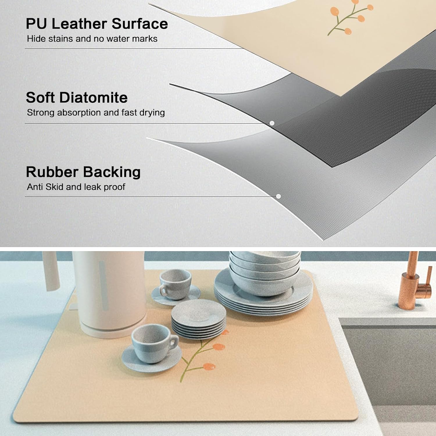 - 【Super Absorbent & Quick Dry】Using the natural soft diatomaceous earth material with 90% void distribution, dish drying mat can quickly absorb water and quickly air dry which keep dry without machine.