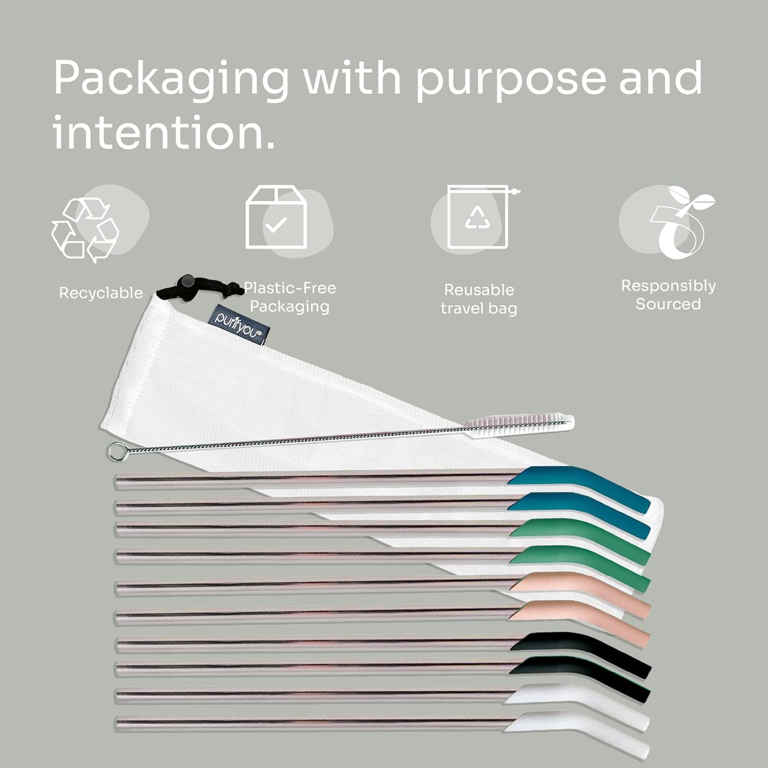 - Reusable straws metal set includes 10 stainless steel straws, 10 silicone tips, cleaning brush, and travel bag. BPA-free, dishwasher safe, and eco-friendly.