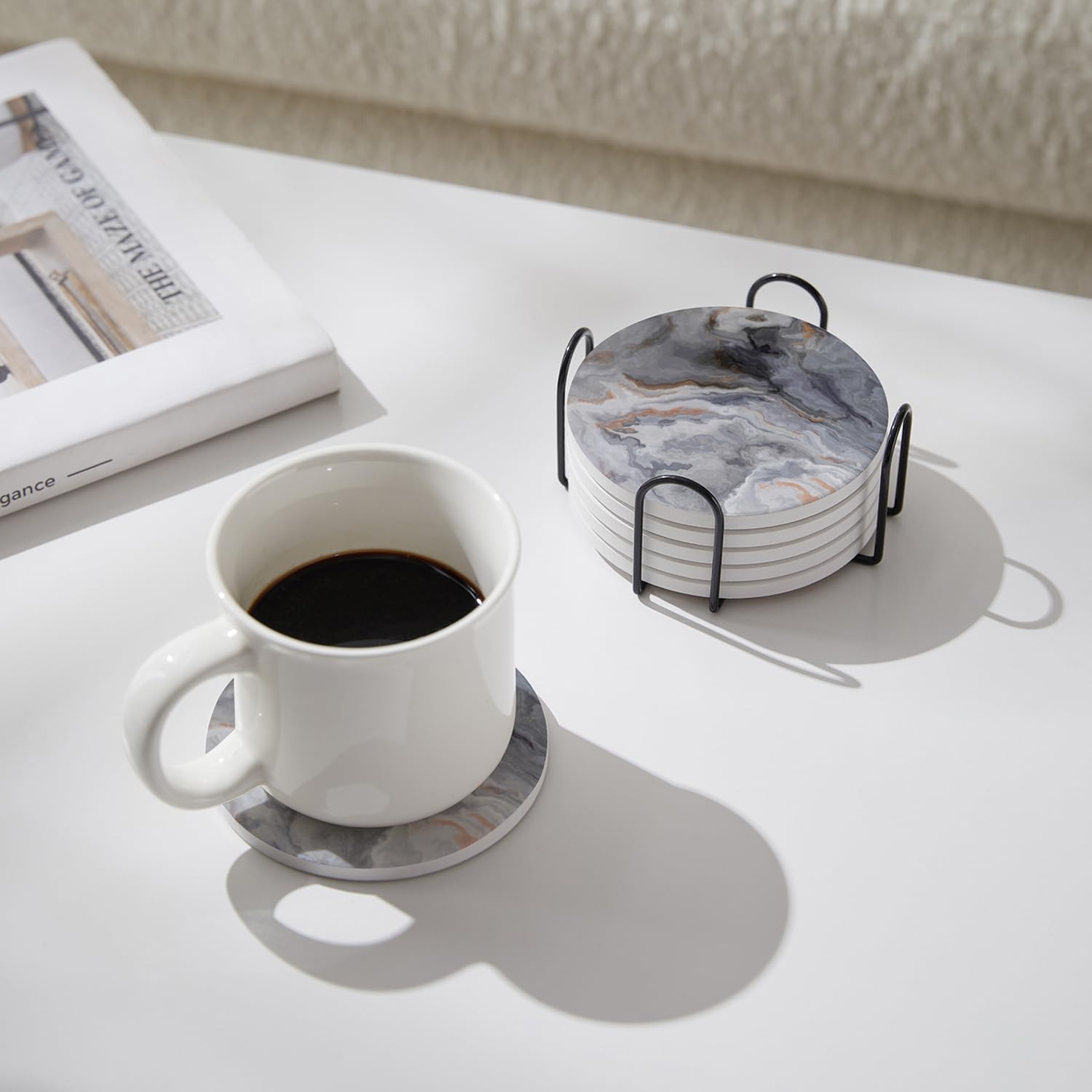 - Quick Water Absorption - Made of high-quality absorbent ceramic, the coasters quickly absorb dripping coffee stains on 5-10 seconds that can keep your table shiny and clean.In addition,it equipped with a cork backing to prevent scratches on the table.