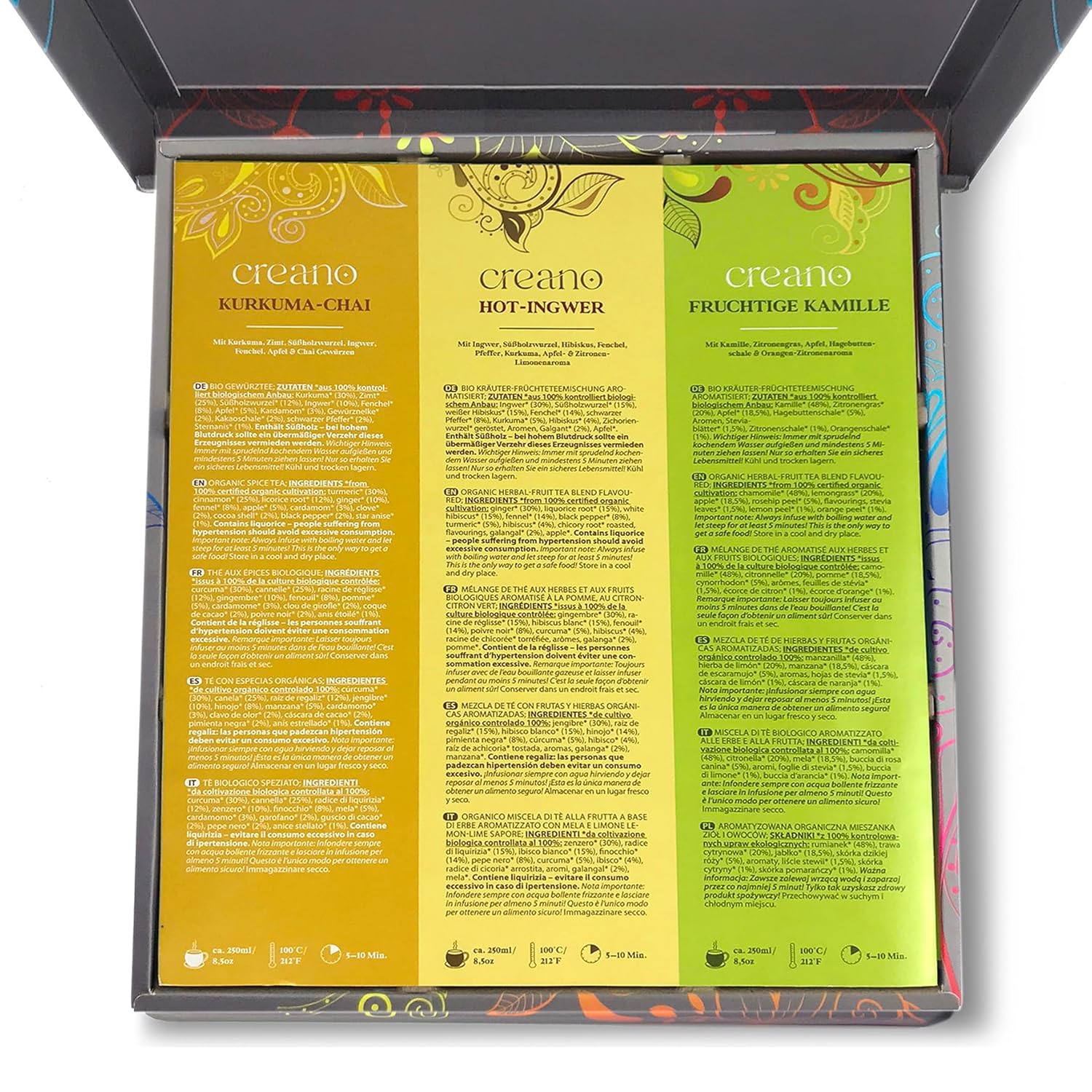 - Creano Organic Herbal Fruit Spice Tea Mix Gift Set "Organic Herbal Tea" is a unique blend of the different organic tea varieties: Fruity Chamomile, Hot Ginger, Turmeric Chai, Rooibos Mango, Sweet Red Chai, Evening Tea, Sweet Mint, Gentle Mood and Wellness Tea; 100% Organic, 9 x 5 Tea Bags
