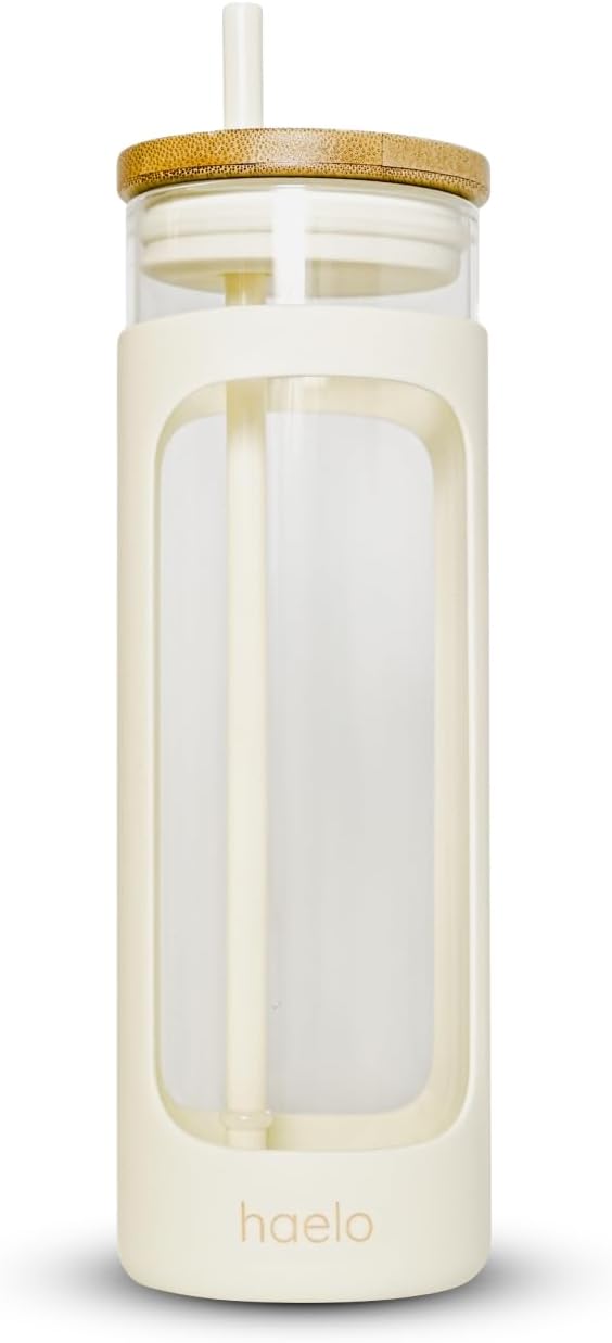 haelo 20oz Glass Tumbler Water Bottle, Iced Coffee Cup with Straw, Silicone Protective Sleeve, Bamboo Lid Reusable BPA Free (Dune)