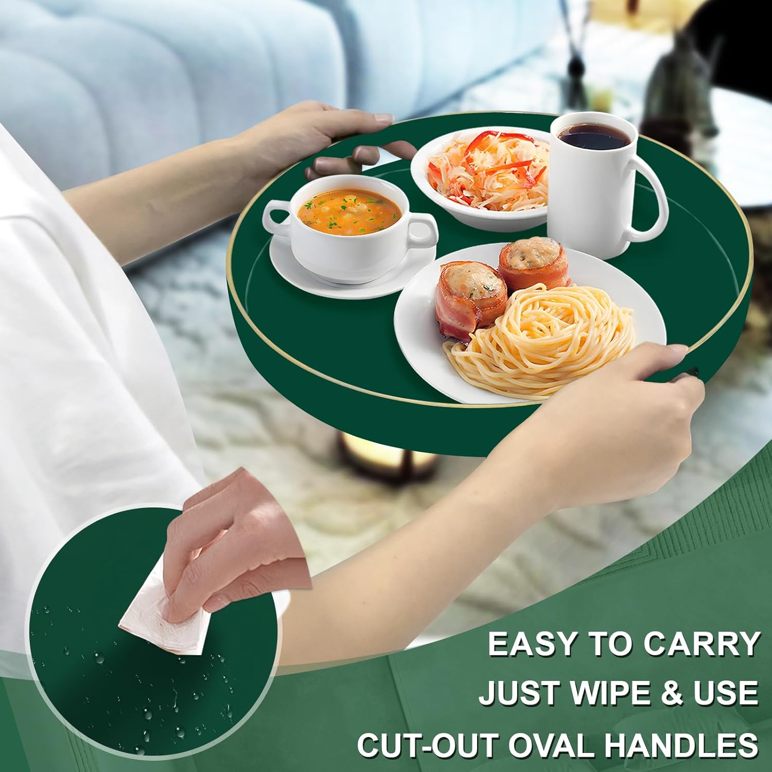 - LIGHTWEIGHT: Decorative serving tray is made of high-quality plastic, durability and lightweight. Green round tray with built-in oval handles that are comfortable to grip and carry while avoiding any strain on your fingers. The serving tray for ottoman has surrounding 1.6" tray lips that prevent items from falling over.