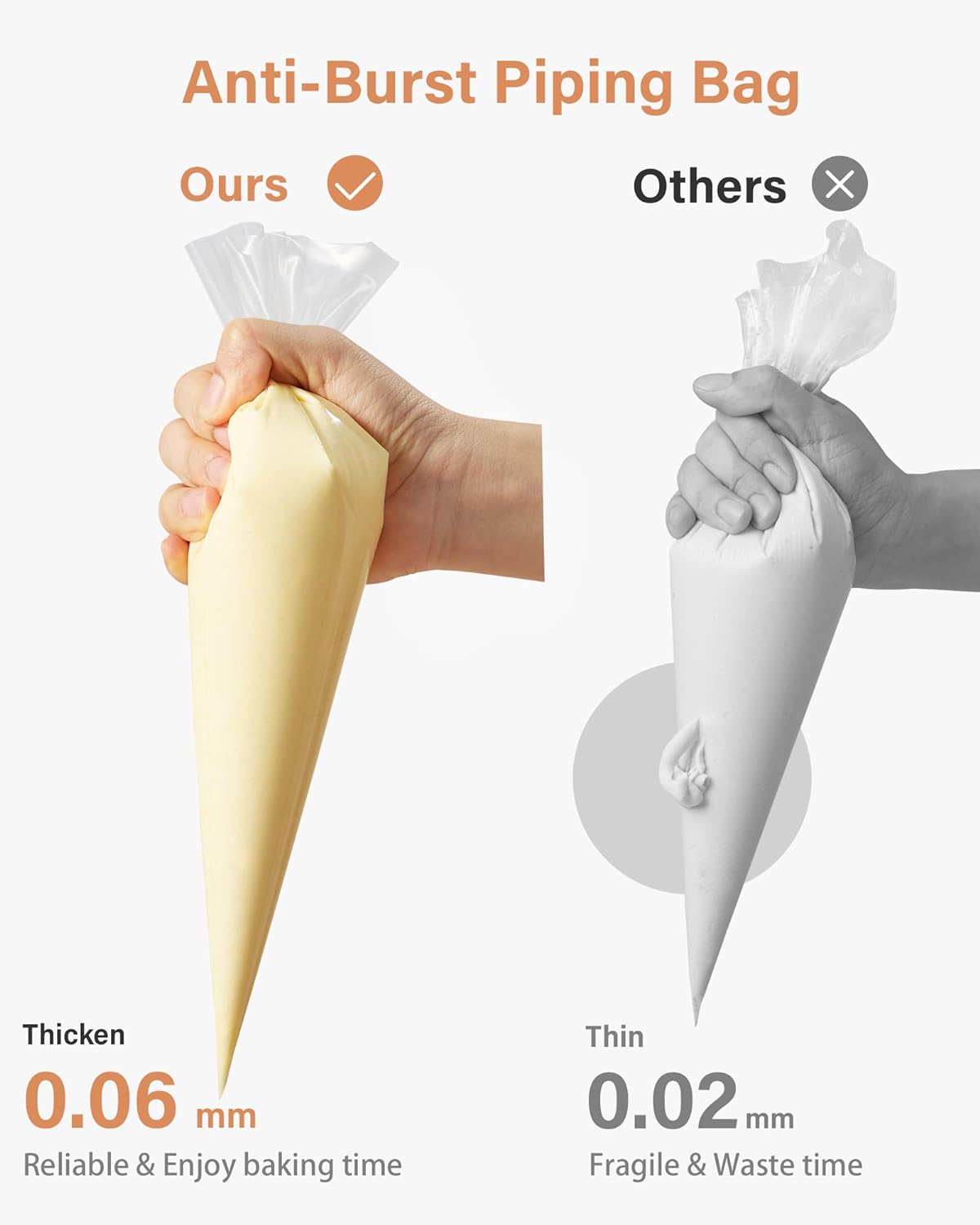 - Anti-Burst Frosting Bags: Each pastry bag is constructed with durable and thick LDPE material with a thickness of 0.06mm, which is 0.02mm to 0.04mm thicker than regular piping bags. This allows our bags to withstand strong squeezing forces without the risk of bursting. By twisting the top, you can easily squeeze out the filling without worrying about the bag rupturing.