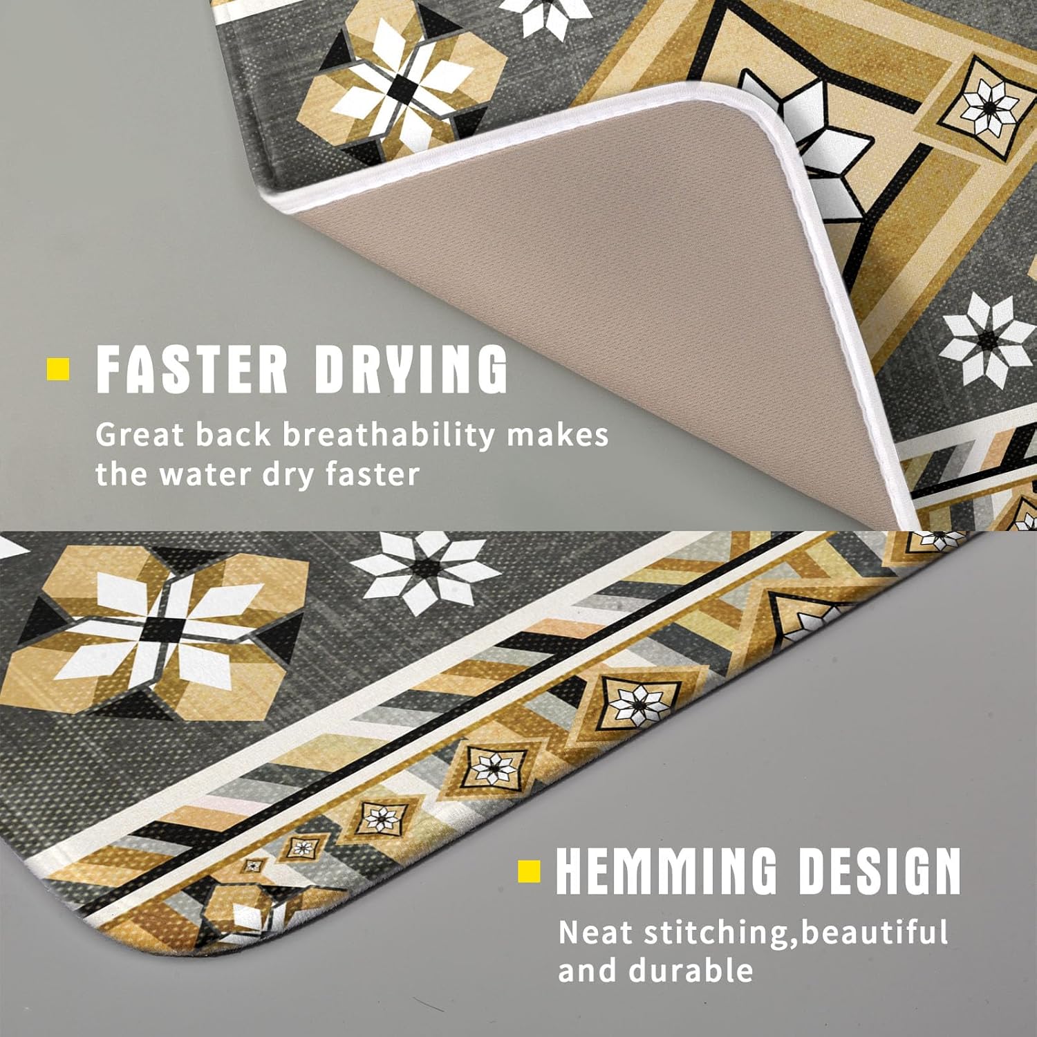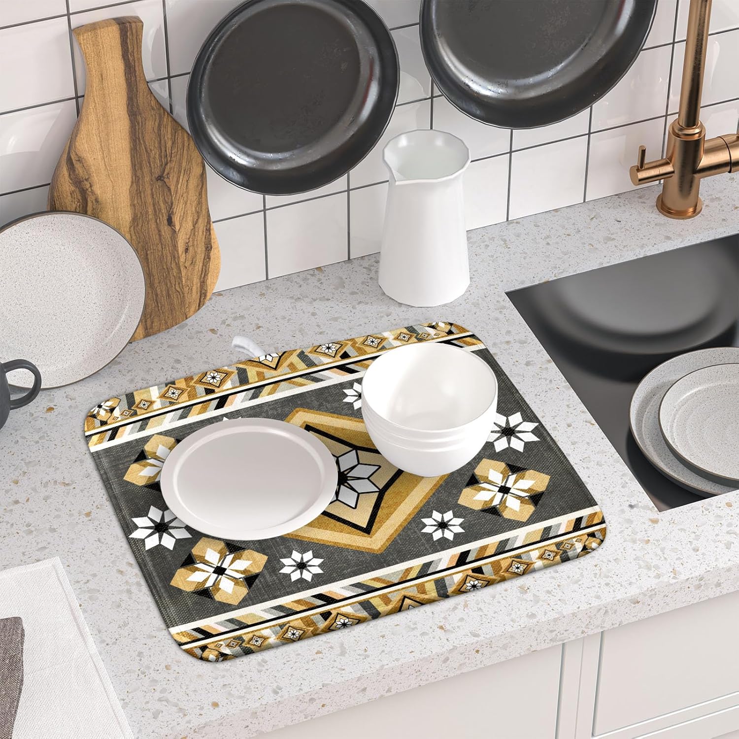 - 2【Widely Used】: The yellow gray boho flower dish drying mats for kitchen counter countertop, coffee bar, dish drain rack, great for air drying dishes, glasses, silverware, pots, pans, fruits and vegetables. It's fade resistant and never stain your kitchen counter topand keep your counter dry.