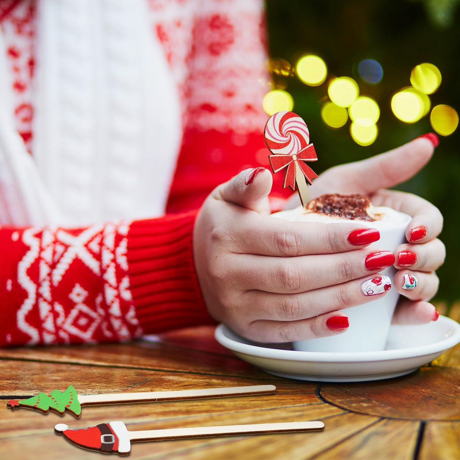 Jinei 120 Pcs Christmas Wooden Coffee Stirrers Wood Cocktail Coffee Stir Sticks Disposable Drink Stirrers for Stirring Hot Chocolate Milkshake Restaurant Home Office(Novel Style)