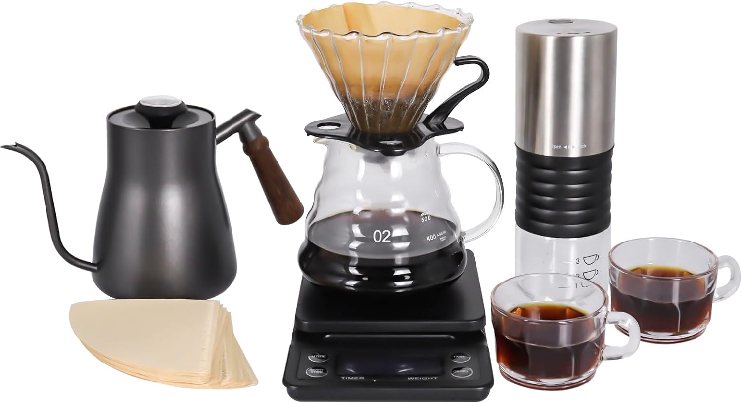 - ☕【Set Includes】 The SOTECH Coffee Maker Set includes an electric grinder, 850ml hand brewing pot,glass dripper server,scale with timer,filter paper and a convenient travel bag. Everything you need to make the perfect cup of coffee is included in this set.