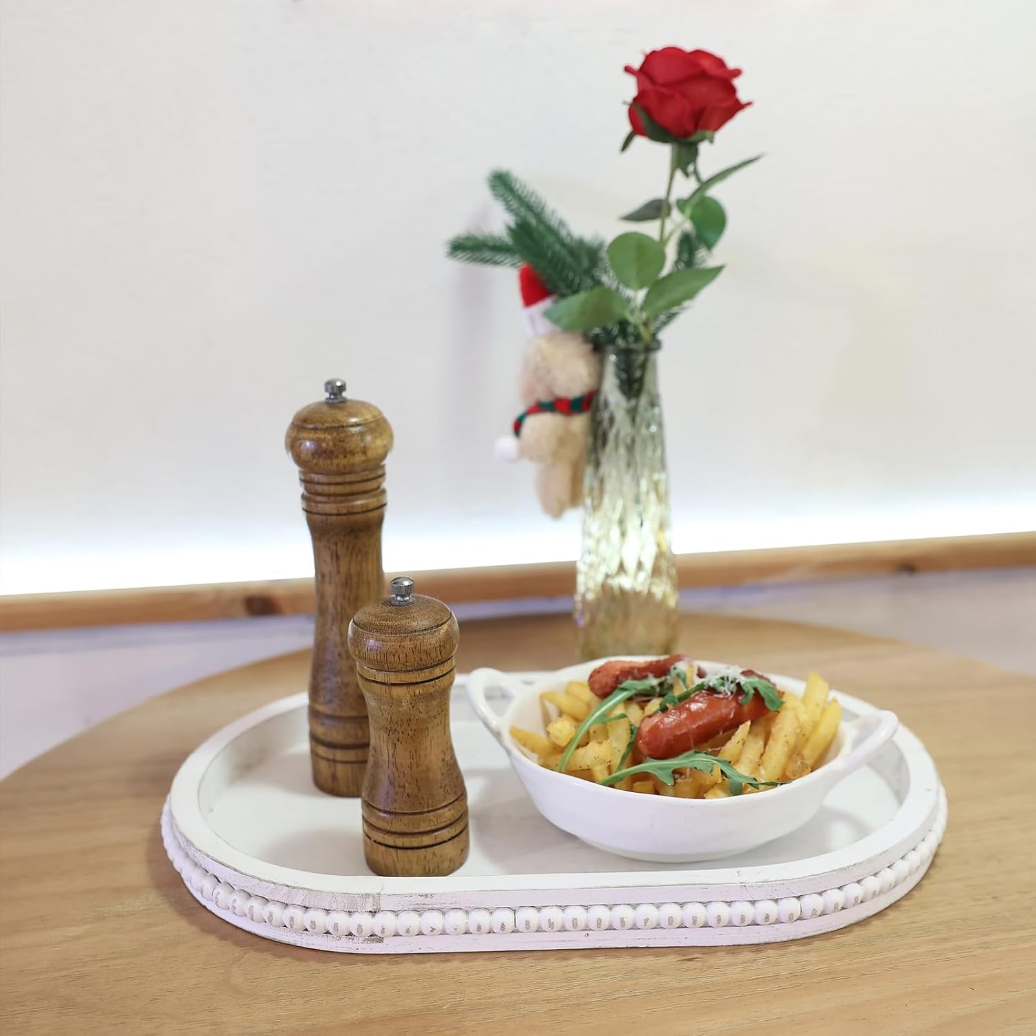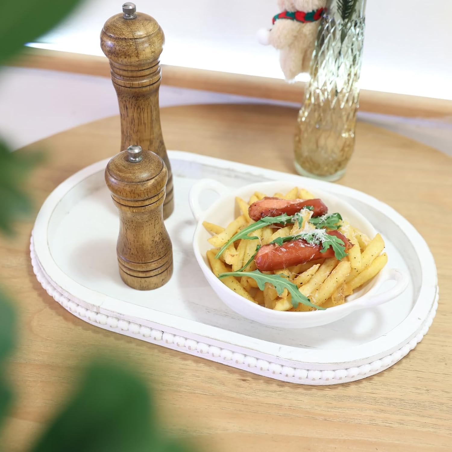 Oval Wood Serving Tray with Wooden Beads, Outdoor Farmhouse Decorative Tray for Ottoman, Coffee Table, Kitchen Counter Organizer, Home Decor(Whitewashed)