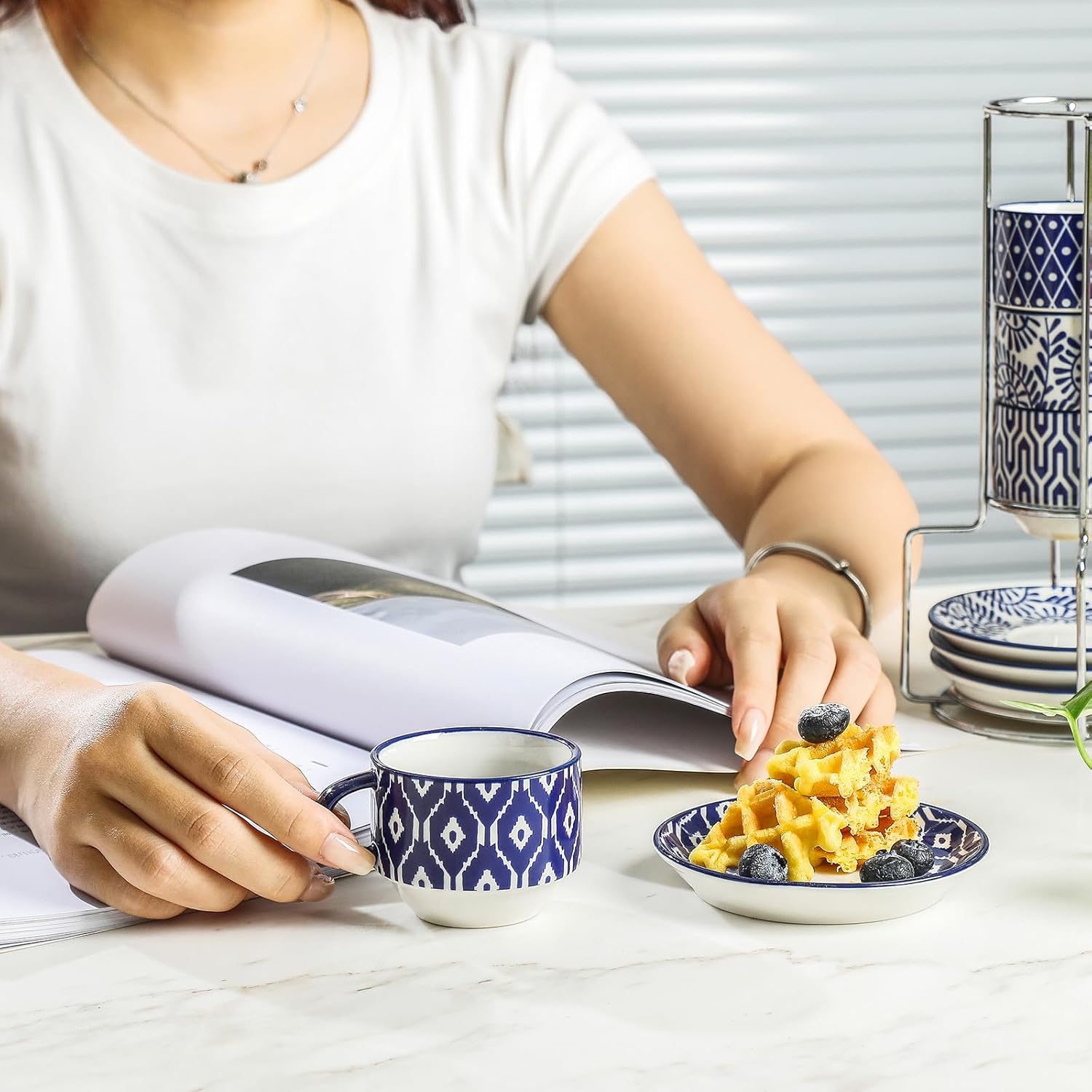 Selamica Ceramic Espresso Cups with Saucers and Metal Stand, 2.5 OZ Stackable Demitasse Cups for Espresso Latte Café Mocha Tea, Set of 4, Vintage Blue