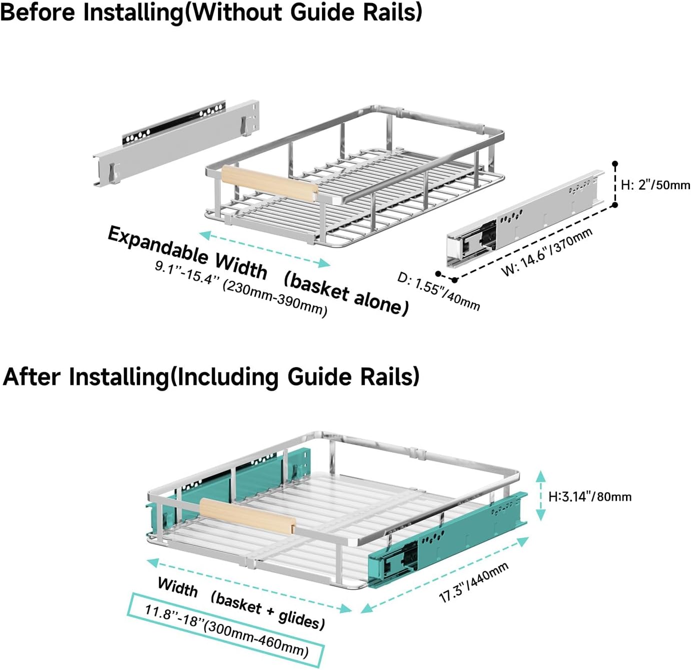 - Expandable Width: The width of this upgraded expandable pull out cabinet organizer can be extended from 11.8" to 18" (includes the rails) and 17.3" in depth, which can fit most kinds of the cabinets in kitchen. You also can fix it under the sink to store your spice rack, pots, pans, baking sheets, all your cook and bake wear.