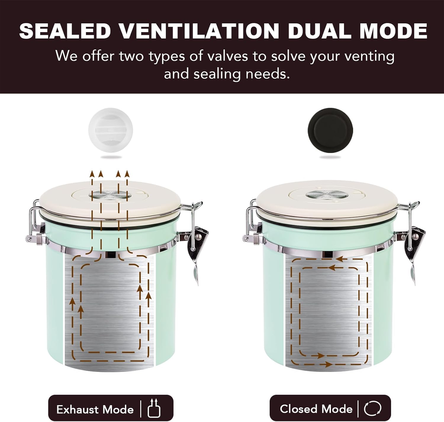 - Two Exhaust Modes: Our coffee cans offer two valves, White Exhaust Mode, Black Off Mode,which keeps air out and prevents harmful oxidation through a one-way CO2 valve and silicone rubber seals. thus helping to maintain the freshness of the coffee beans.