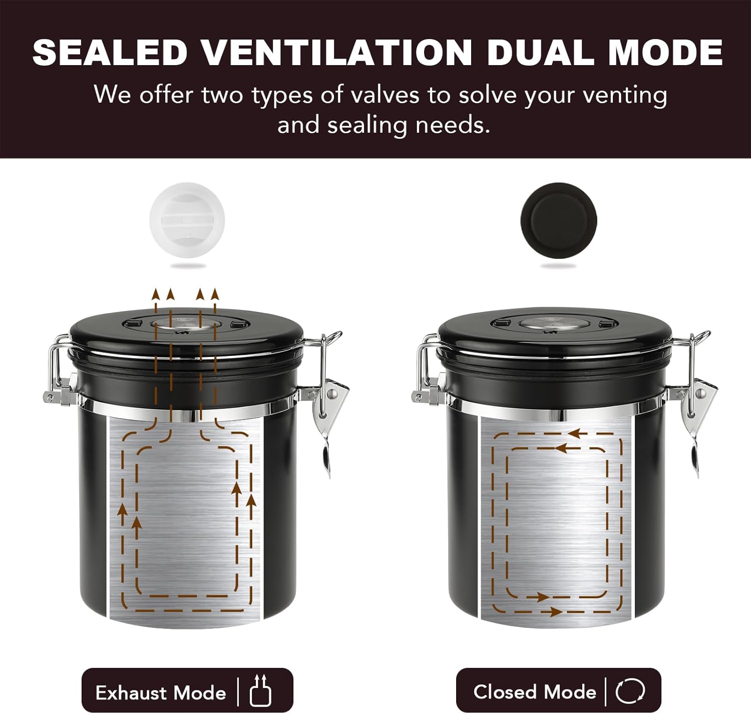 - Two Exhaust Modes: Our coffee cans offer two valves, White Exhaust Mode, Black Off Mode,which keeps air out and prevents harmful oxidation through a one-way CO2 valve and silicone rubber seals. thus helping to maintain the freshness of the coffee beans.