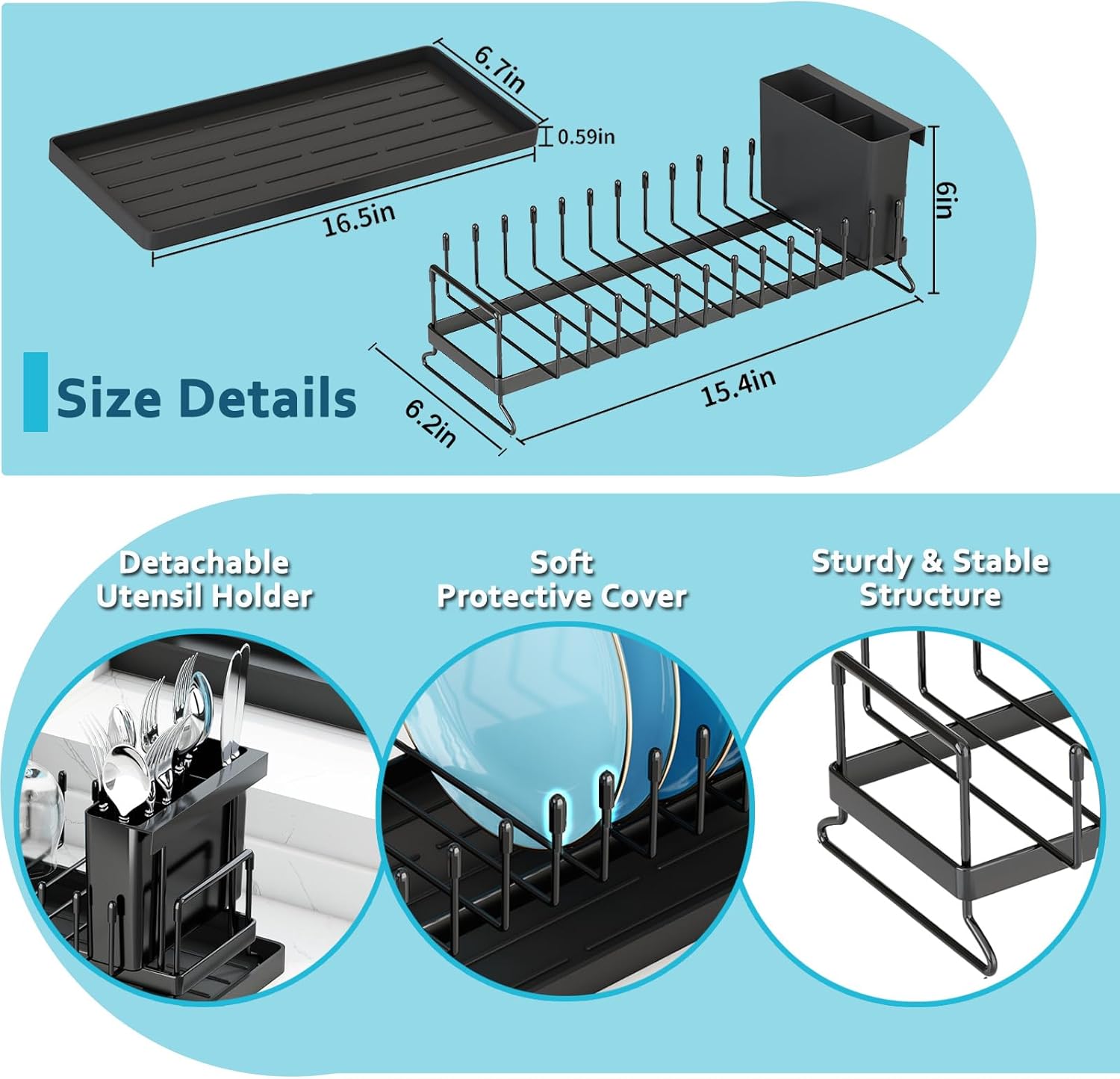 - COMPACT DESIGN: A small dish drying rack designed for limited spaces! Take up less counter space but holds a good amount of dishes. DIMENTION: 16.5"L x 6.7"W x 6"H. Fits perfectly beside the kitchen sink, in/under the cabinet or cabinet drawer. Suitable for small kitchen, small apartment, campers, RVs and more.