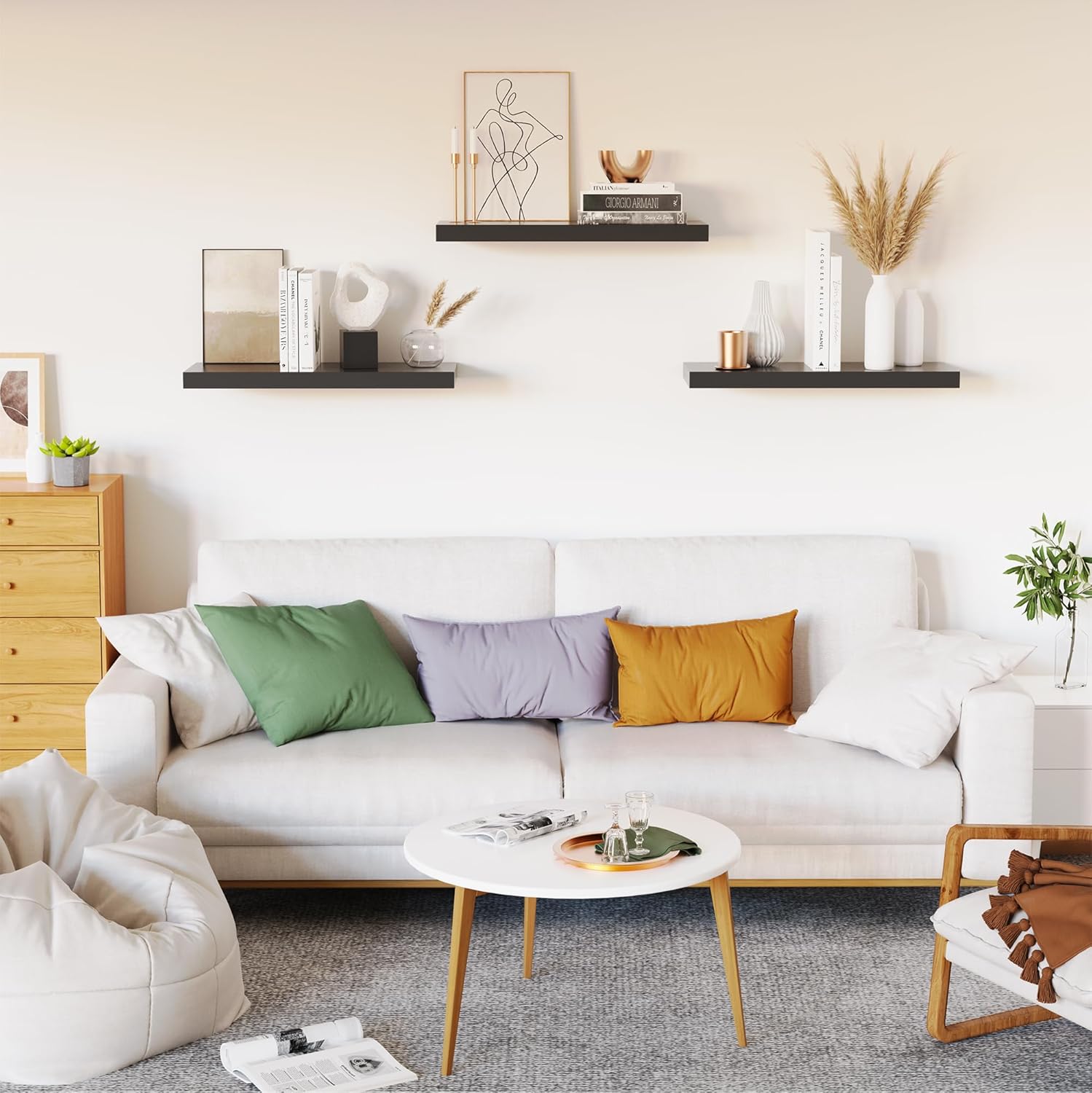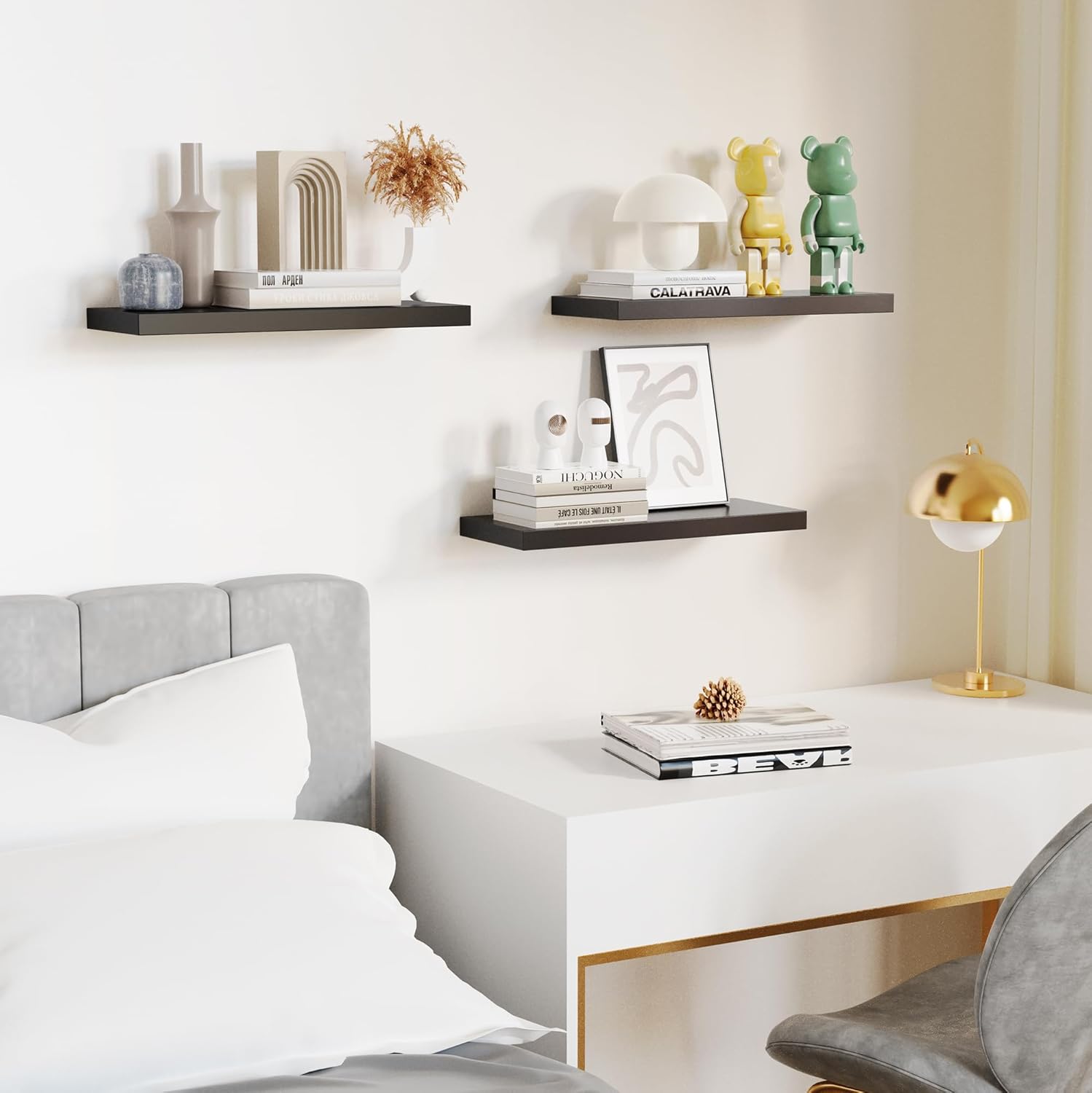 - 【Versatile & Functional】Our white floating shelves for wall can simplify our life which let everything will be in reach. Our wall shelf is a perfect space to display our family pictures, books, memorandums, charming antiques or artwork, spices or jars and fresh green plant. Our floating shelf wood not only give us extra storage but also improve the beauty of our home decor. Our white shelves can be perfectly integrated and decorated in the bathroom, kitchen, living room, bedroom and other place.