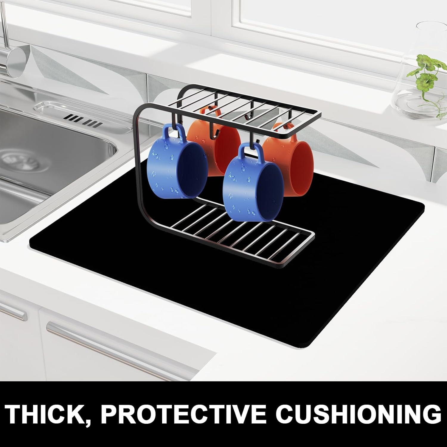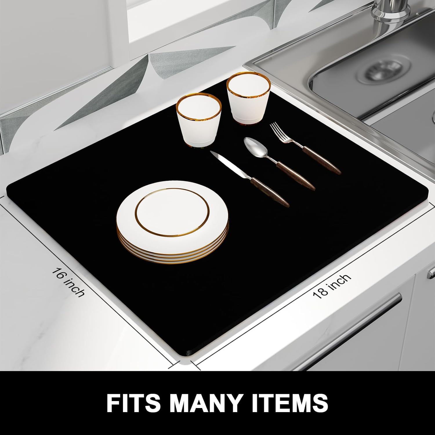 Rnivvi Dish Drying Mat, 16x18" Absorbent Drying Mat for Kitchen Counter, Cute Heat Resistant Dish Drying Pad Anti-Slip Dish Mat Drying Kitchen Mat, Dish Rack Mats for Bar Counter, Jet Black