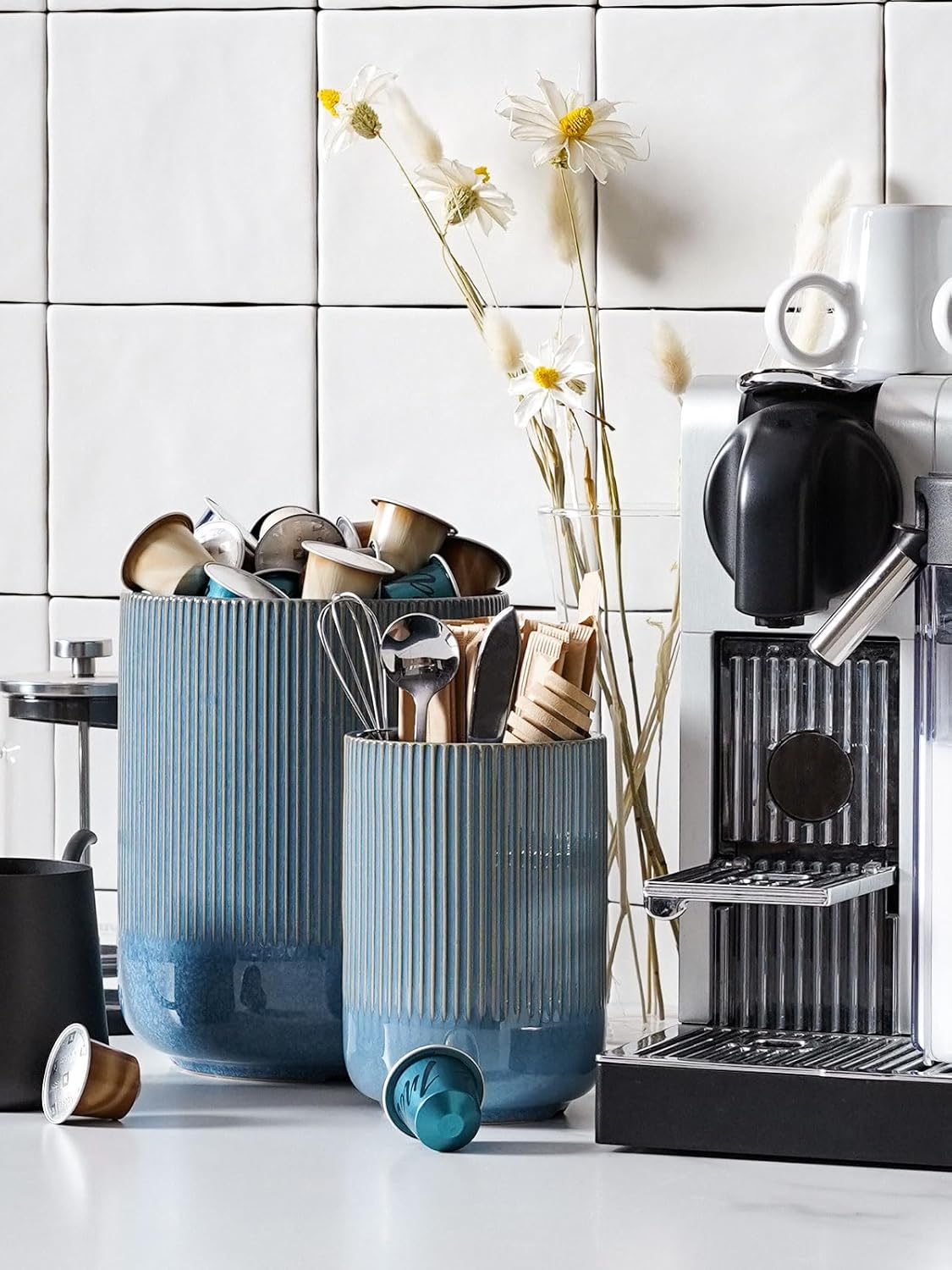 - Coastal Home Decor: Our kitchen utensil organizer features a navy oceanic finish highlighted by vertical ribbed and fluted stripes; This stylish design seamlessly complements any kitchen decor, elevating both your culinary efficiency and the overall ambiance of your home