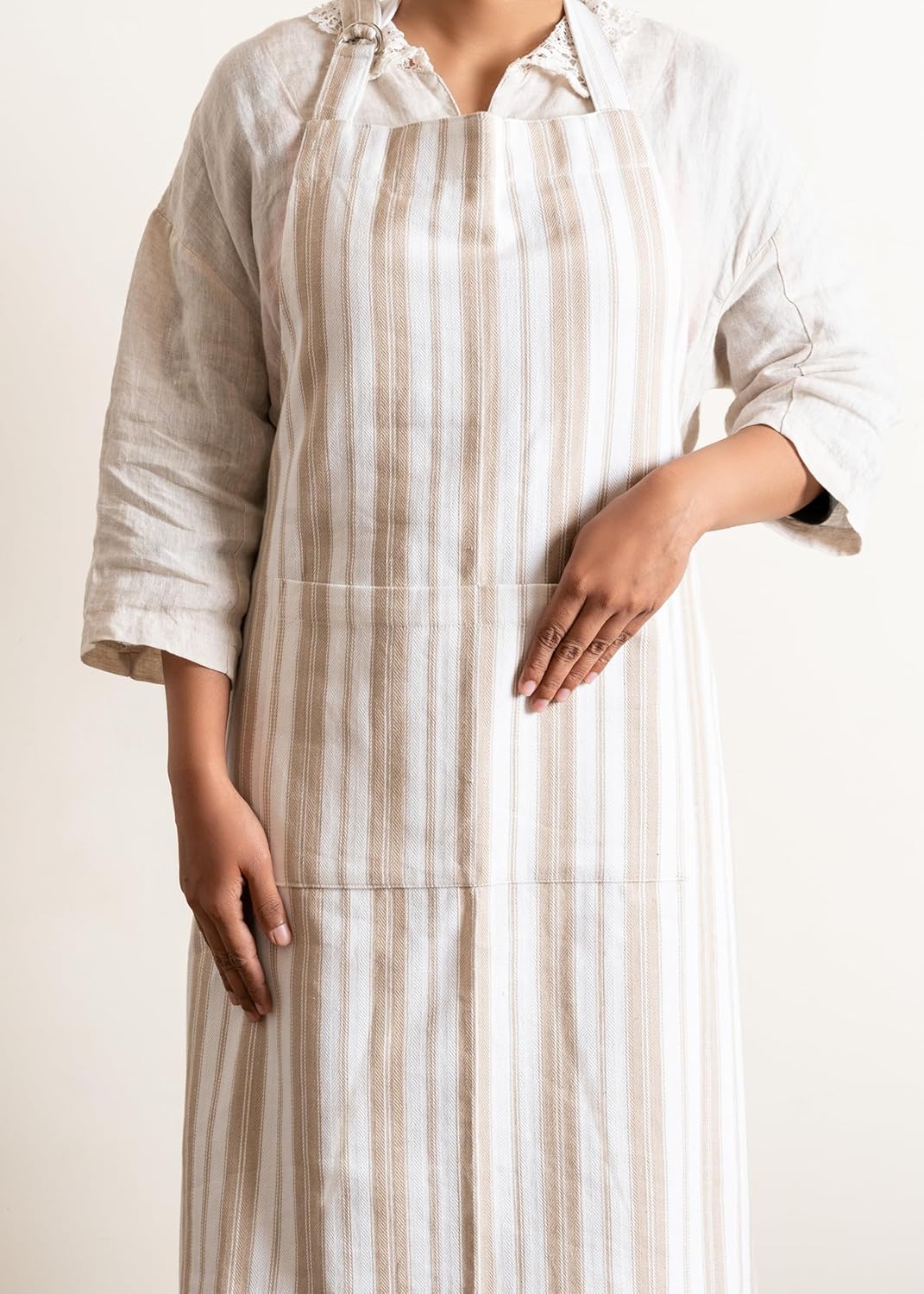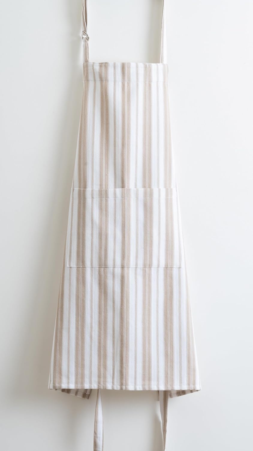 1 Oven Mitt, 1 PotHolder & 1 Kitchen Apron Set - Durable Heat Resistant Gloves - Thick Mittens for Kitchen - Suitable for Cooking, Baking, Grilling – for Men & Women – Taupe Stripes - Casa De Lan