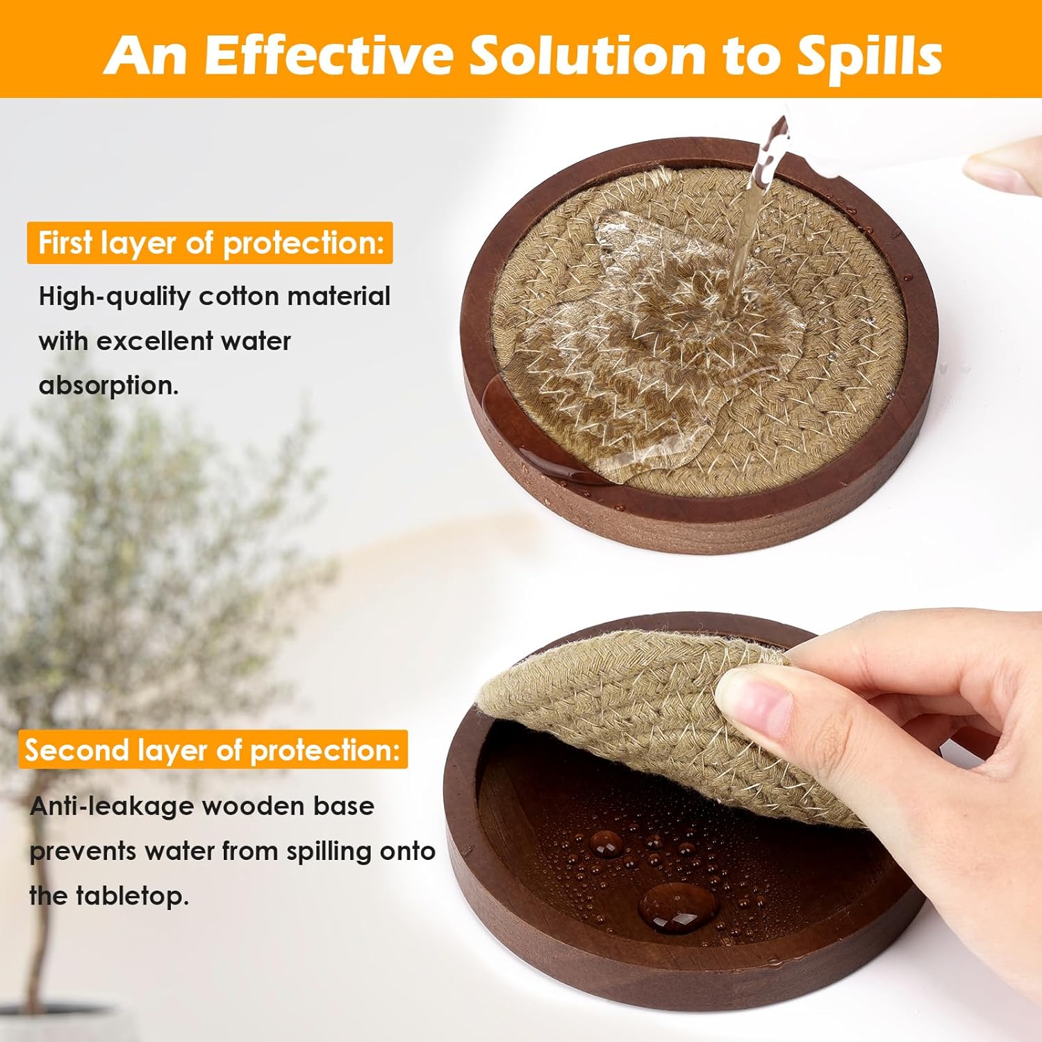 - Wood & Cotton Coasters for Drinks: The absorbent coaster set contains 6 coasters and 1 holder. Our new cotton and wood 2-in-1 coaster is unique and can be used on its own. If both are used at the same time, they will have double the water absorption effect and better protect the furniture. Using these 2-in-1 coasters will make your experience even more comfortable.