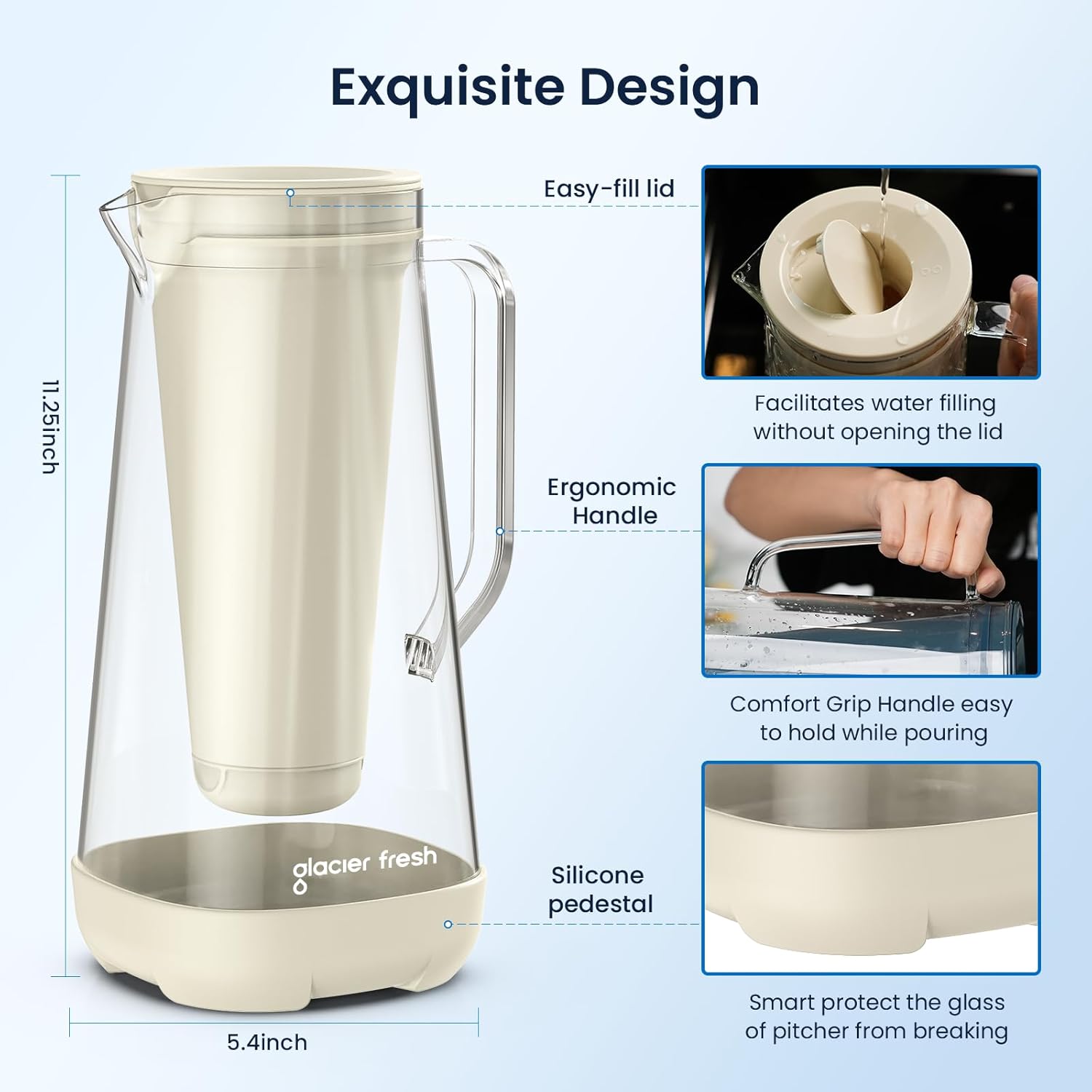 - Eco-Friendly: GLACIER FRESH Purela Water Pitcher can save up to 300 standard 16.9-ounce plastic water bottles or up to 2100 bottles a year. The filter can not only lower your costs and Improve taste but also reduce the waste of plastics and protect the environment.