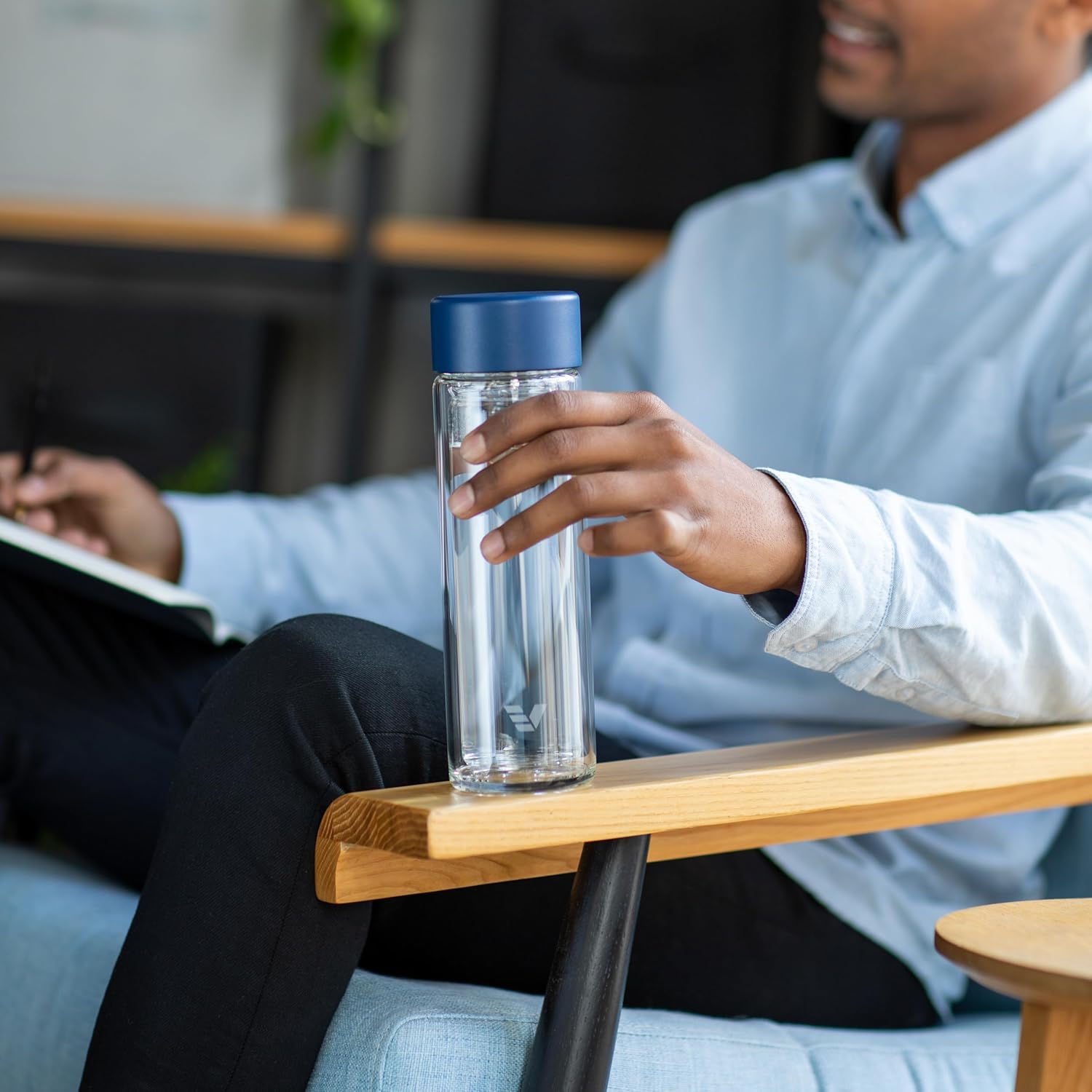 Glass Multi Tea Infuser Bottle 14oz - Double Wall Borosilicate Glass Flask | No Plastic Touches Contents | Perfect for Office or Home - Blue
