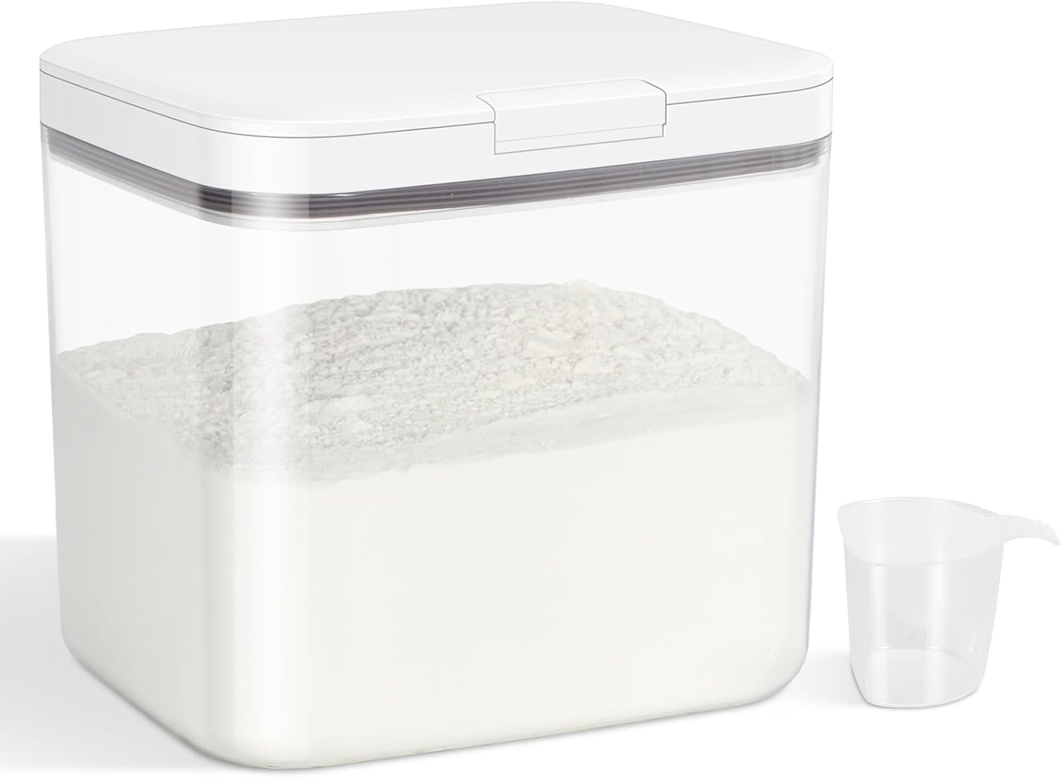 - INTEGRATED MEASURING CUP: The laundry powder container come with a measuring cup, ensuring easy food scooping. The lid with dual silicone gasket will keep out moisture or dust, always keeping the inside items super fresh and dry