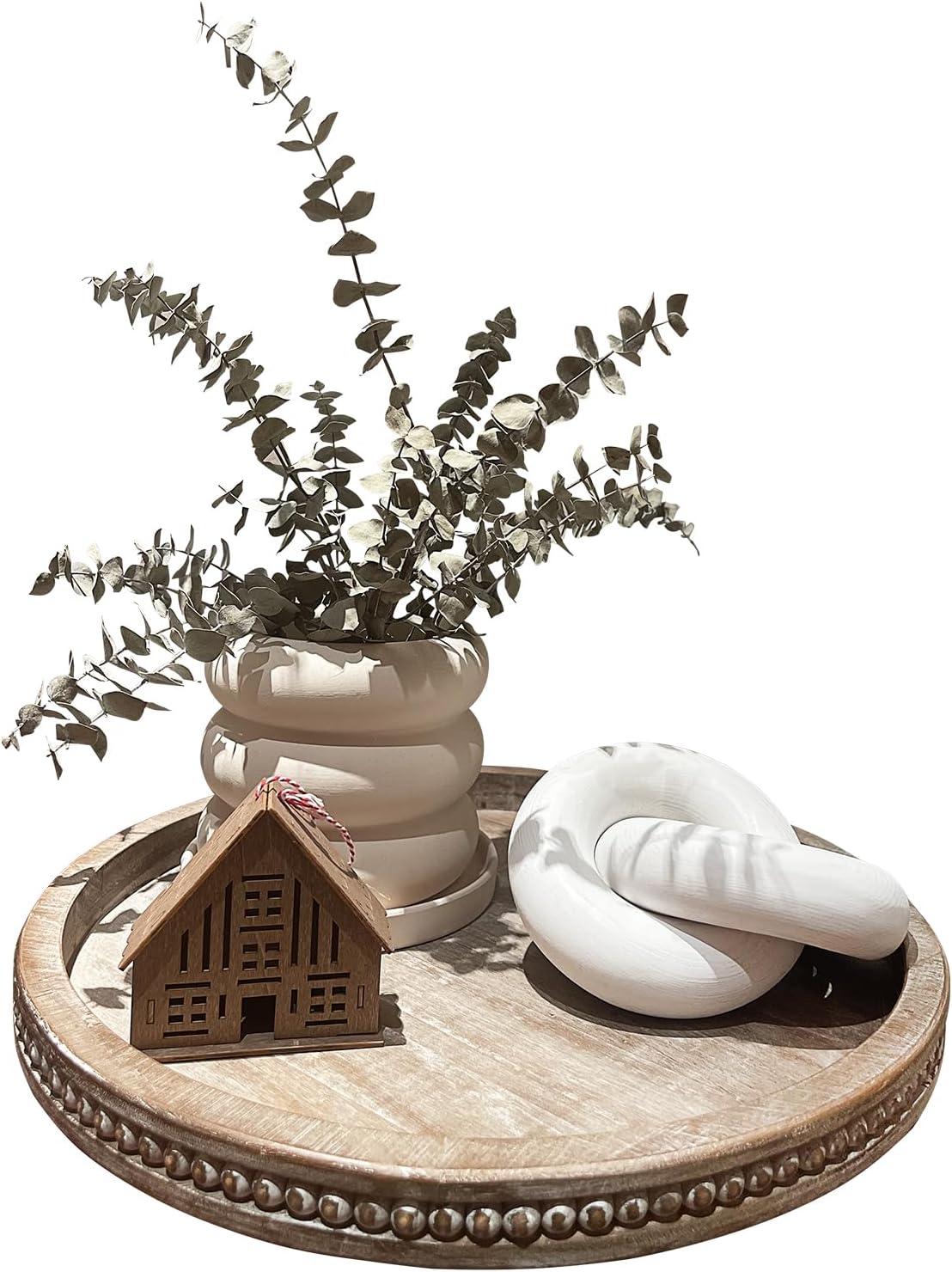 - [Unique Wood Grain]: Our round wood tray is made of premium natural pine wood,both durable sturdy and super lightweight,hard-wearing and serviceable for a long period to use. The wood trays home decor that come to you are unique.