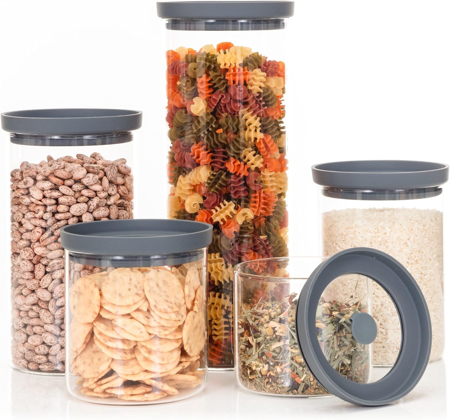 - Sophisticated Pantry Organizers: Each crystal-clear glass container in this 5-pack set (54oz +37oz+28oz+22OZ+17.5oz) and has a sealed lid in chic gray silicone for pretty and practical kitchen organizing