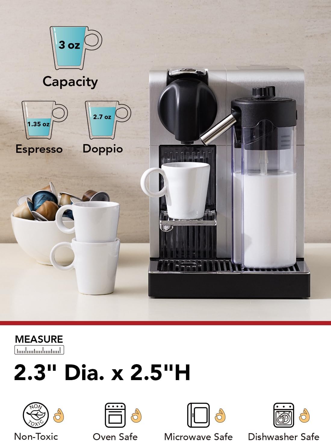 - 3 oz for Espresso: Savor the rich, bold flavors of Italian espresso in our specially designed 3 oz espresso cups; With a diameter of 2.3 inches and a height of 2.5 inches, they are the perfect size for enjoying a true shot of espresso