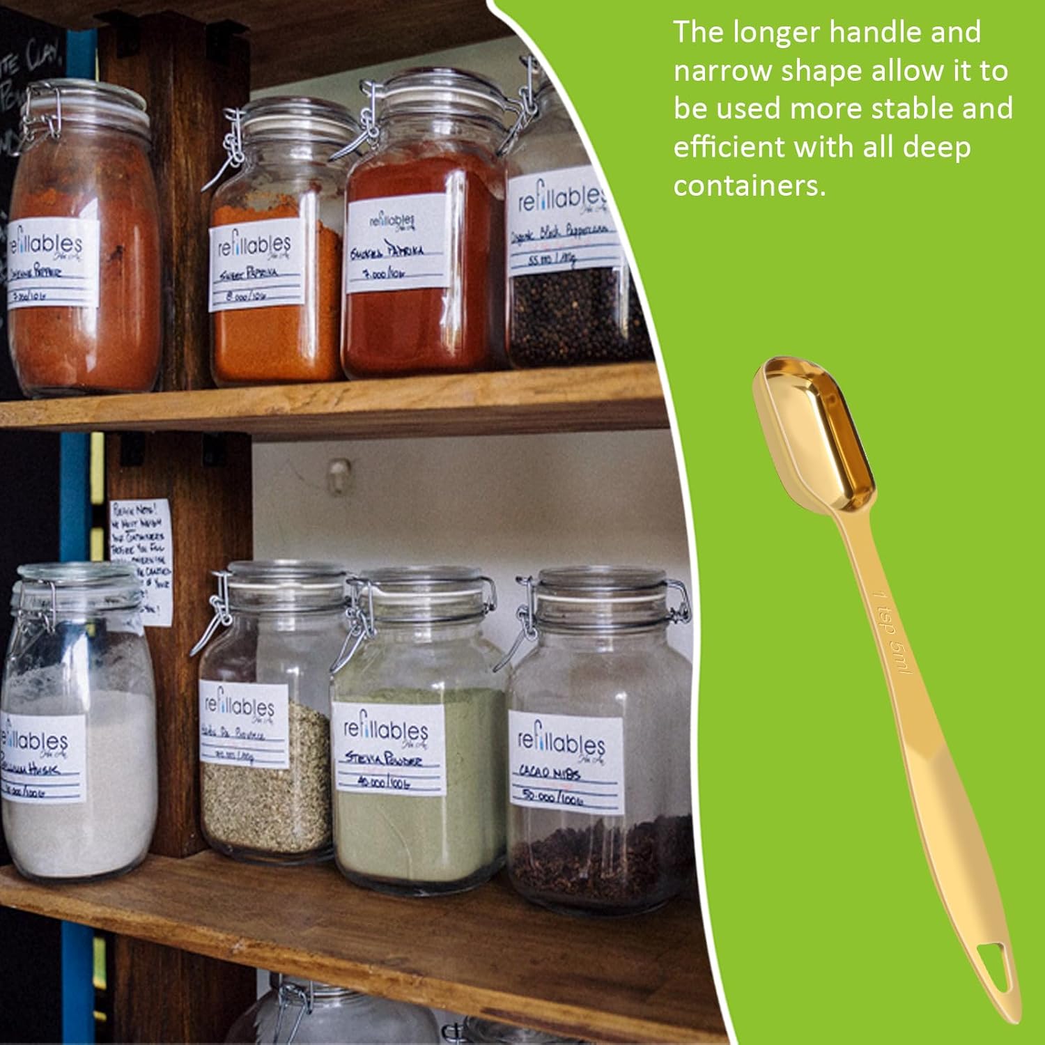 - 【High Quality】Unlike ordinary measuring spoons, the durability measuring spoon is 100% made from food-grade 304 stainless steel with rectangular & narrow design to ensure that the spices will not be spilled. The longer handle and narrow shape allow it to be used more stable and efficient with all deep or shallow spice jars, bottles, and containers.
