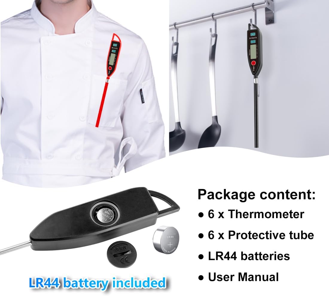 BOMATA 6 Pack Waterproof IPX7 Meat Thermometer Instant Read Food Thermometer with Long Probe for Water, Liquid, Kitchen Cooking, Grill,BBQ ! T101 X 6 Pcs (Black & Red & White)…