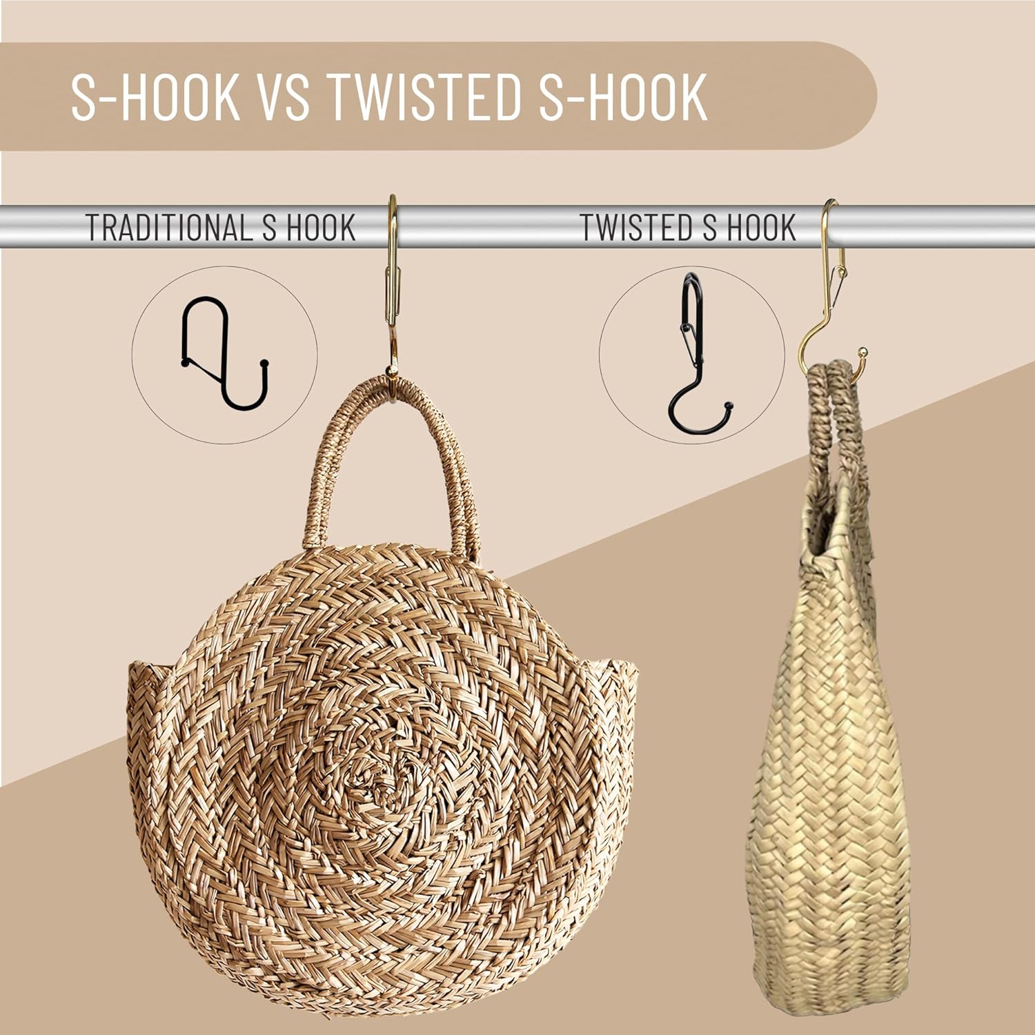 6 Purse Hanger for Closet. Tote Hanger. S-Shaped Hooks S Hooks Twist Design. Anti Drop S-Shaped Hook for Hanging Handbags with Safety Buckle to Prevent Falls. Heavy Duty. (Gold, Twisted)