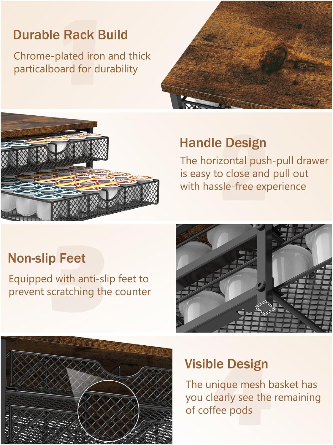 - Sturdy & Stackable Design:Coffee pod organizer for k cups is made of high quality wood and sturdy metal frame. The sturdy and durable wooden worktop is not easily deformed and provides strong support for the coffee machine. And you can stack multiple coffee racks together to increase the available space.A sliding pull-out drawer for easy capsule selection, easy to clean and long-lasting.