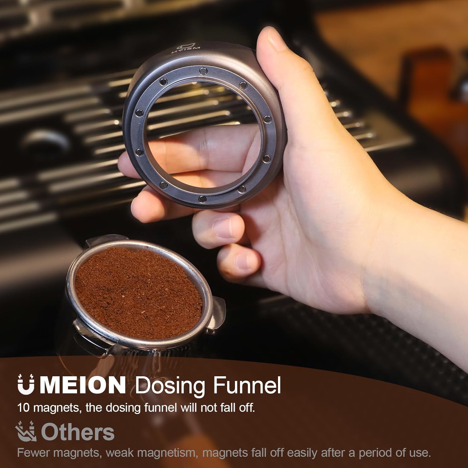 - 【Upgraded Magnetic Dosing Funnel】 10 magnets that hold the dosing funnel perfectly to the basket and won't fall off.