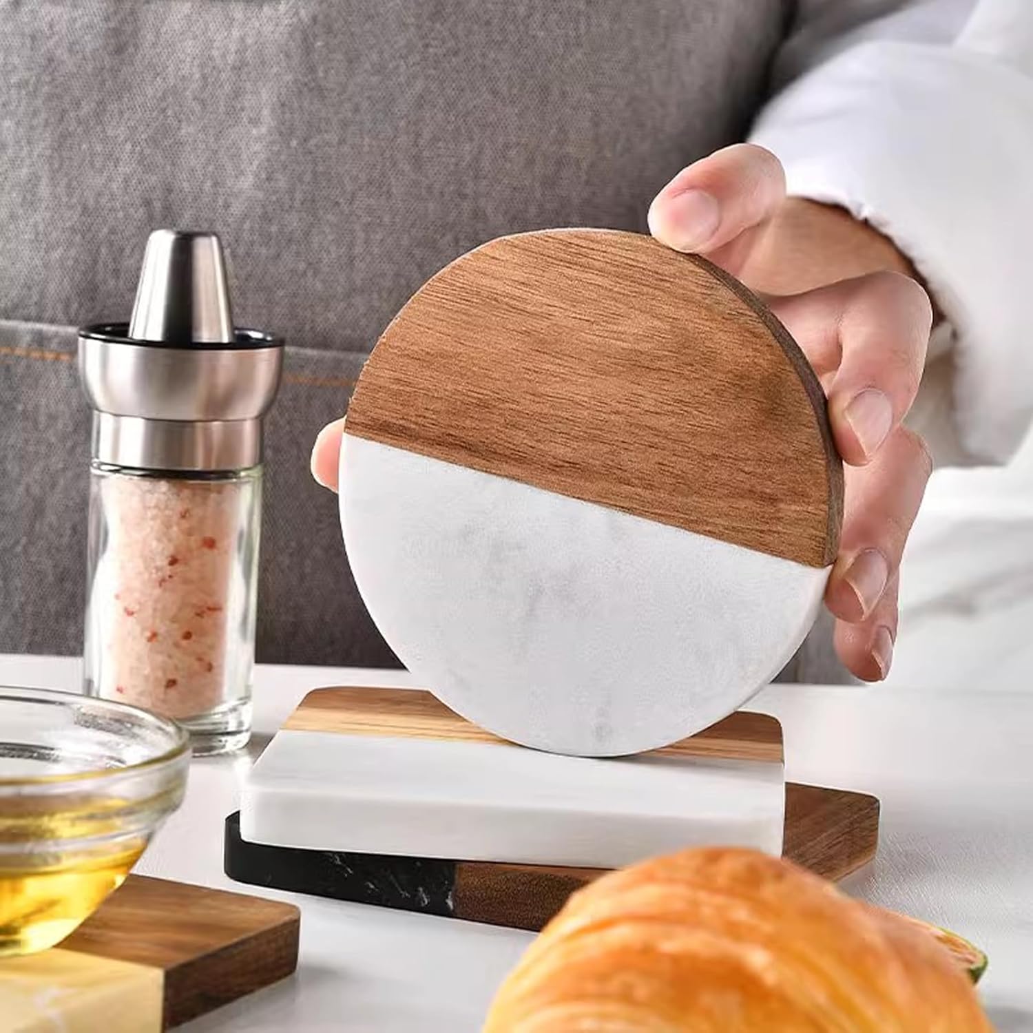 - RUSTIC & MODERN DECORATIVE COASTERS: The marble and wooden coasters are polished ,the smooth surface upgrade modern style of the coasters. They are decorative chic and stylish coasters,decor your home.They are perfect presents for friends or neighbors housewarming,parties,birthday,and holidays.
