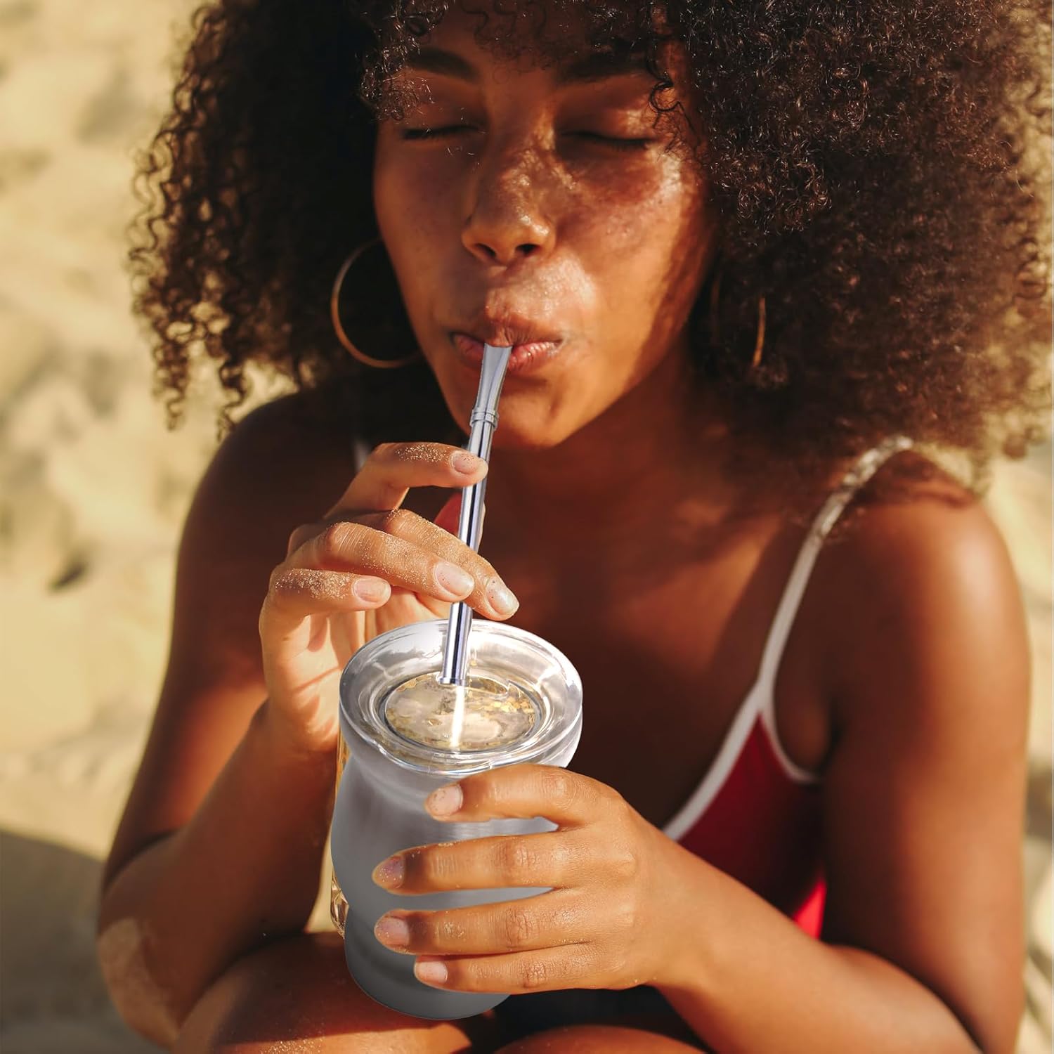 Beruth Bombilla Yerba Mate Gourd, 8oz Stainless Steel Tea Cup Set with Lid, Two Straws and Cleaning Brushes, Double Walled Coffee Mug Heat Insulation Anti Scalding (Bright Silver)