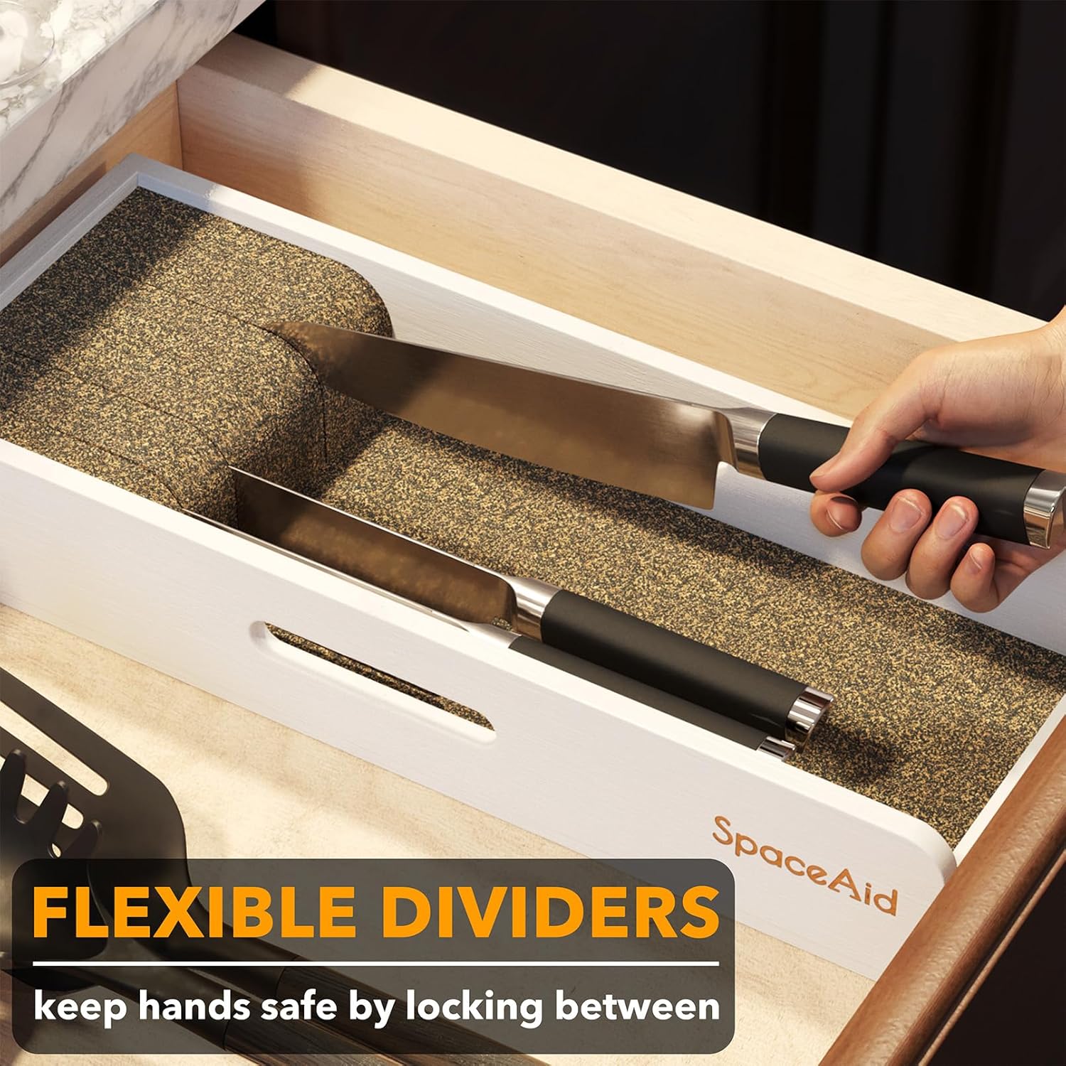 - WHITE ORGANIZED KNIFE DRAWER - Make your kitchen drawer neat and organized with bamboo knife organizer. The knives organizer is designed for your different knives kitchen drawer organization