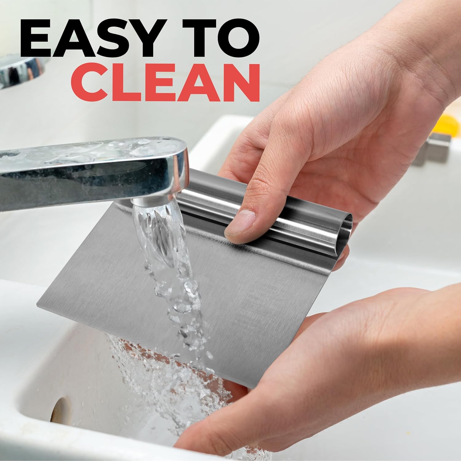 - Versatile Bench Scraper Kitchen Tool: Our dough scraper for baking is a multipurpose kitchen tool, ideal for cutting dough and noodles with ease, slicing butter or pizza, and chopping vegetables like a chopper knife . It also makes an exceptional food scraper tool, smoothly transferring chopped food for mess-free cooking.